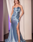 Beautiful asymmetrical strapless neckline with overlapping, pleated wrap bodice. Diagonal pleats across bodice into a pleated skirt with a high leg slit. Luxe stretch-satin fabric with light reflecting shine. Embody elegance in this gown at any formal occasion!