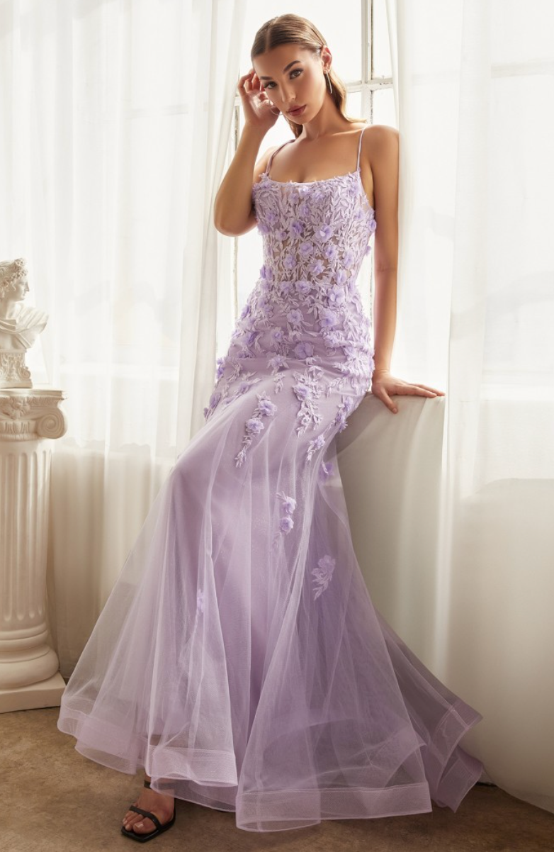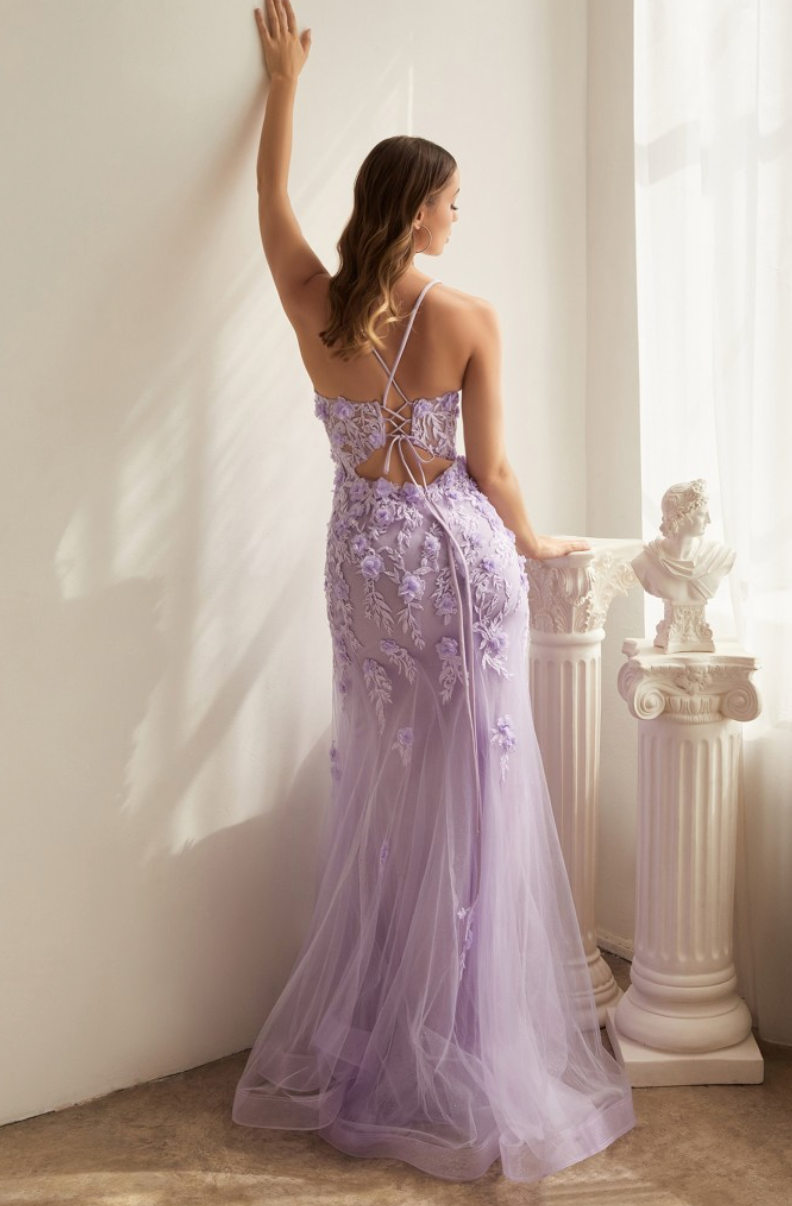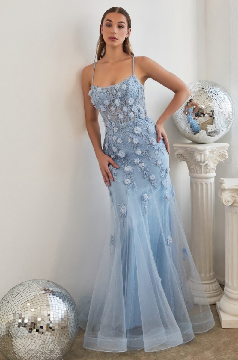 Fitted floral applique tulle gown with lace up back and bustier bodice.