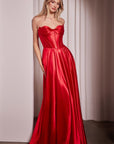 Turn heads in this stunning satin gown, featuring a structured sweetheart bodice that accentuates the waist and flows into a floor-length skirt with a leg slit. Thoughtfully designed with hidden pockets, this gown combines elegance with a touch of convenience.