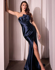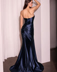 Beautiful asymmetrical strapless neckline with overlapping, pleated wrap bodice. Diagonal pleats across bodice into a pleated skirt with a high leg slit. Luxe stretch-satin fabric with light reflecting shine. Embody elegance in this gown at any formal occasion!