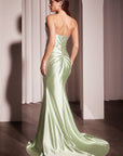 Beautiful asymmetrical strapless neckline with overlapping, pleated wrap bodice. Diagonal pleats across bodice into a pleated skirt with a high leg slit. Luxe stretch-satin fabric with light reflecting shine. Embody elegance in this gown at any formal occasion!