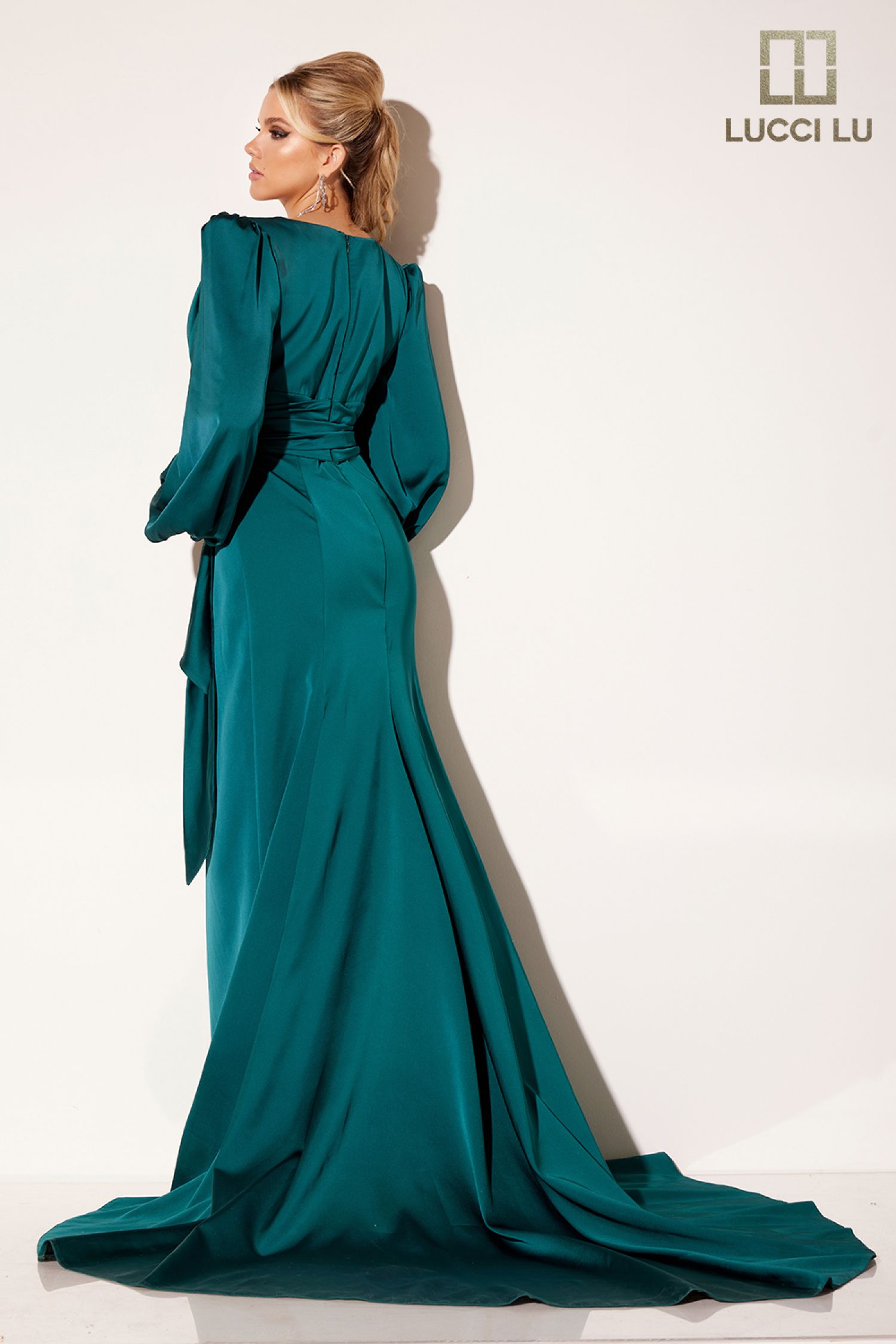 Gorgeous satin long sleeve gown with deep v neckline and billow sleeves.