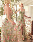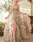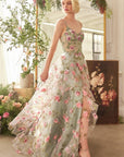 This A-line gown stuns with a sheer corset bodice, soft sweetheart neckline, and dainty straps, all detailed with bold floral motifs. Layers of organza form a tiered ruffle skirt that floats with movement, balancing structure and softness. A lace-up back completes the look with a custom fit and elegant finish.