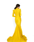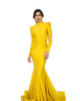 Refined elegance is this formal full-length gown, with high mock-neck, long sleeves, crossover pleating on the bodice, and mermaid flare.