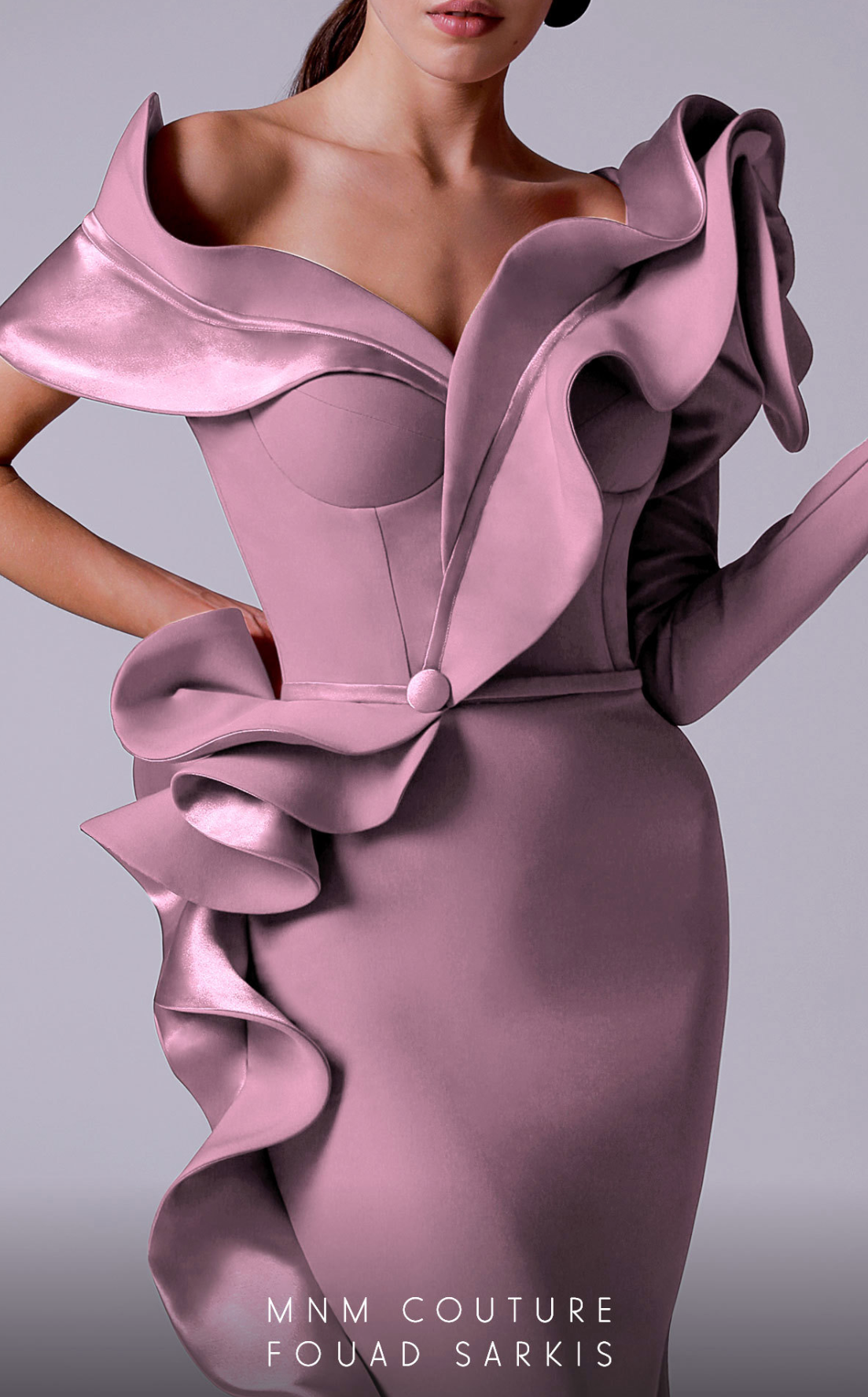 MNM Couture 2714 speaks for itself. This off the shoulder gown has a gorgeously details peplum reaching from the shoulders down one hip. This fitted style is not only elegant but screams mystery and romance.
