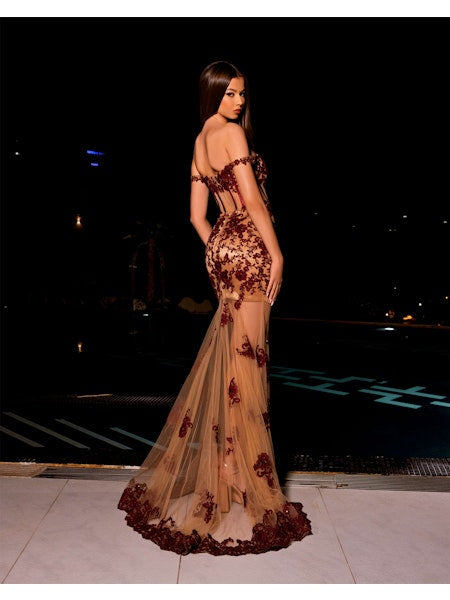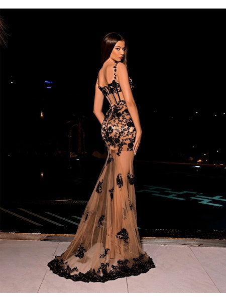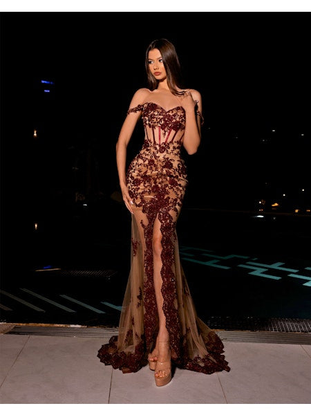 Stunning and sexy lace gown with sheer skirt and front leg slit.