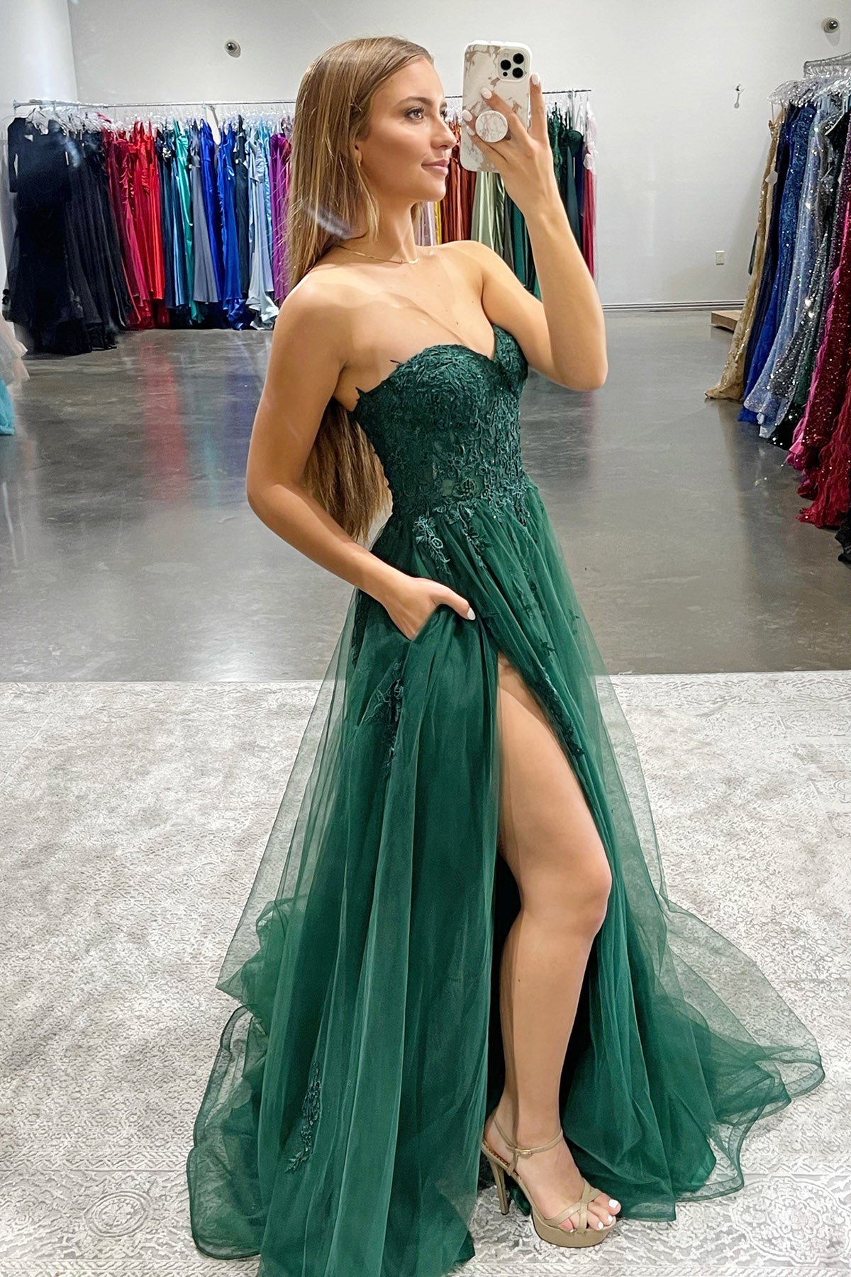 Fitted floral applique tulle gown with lace up back and bustier bodice.