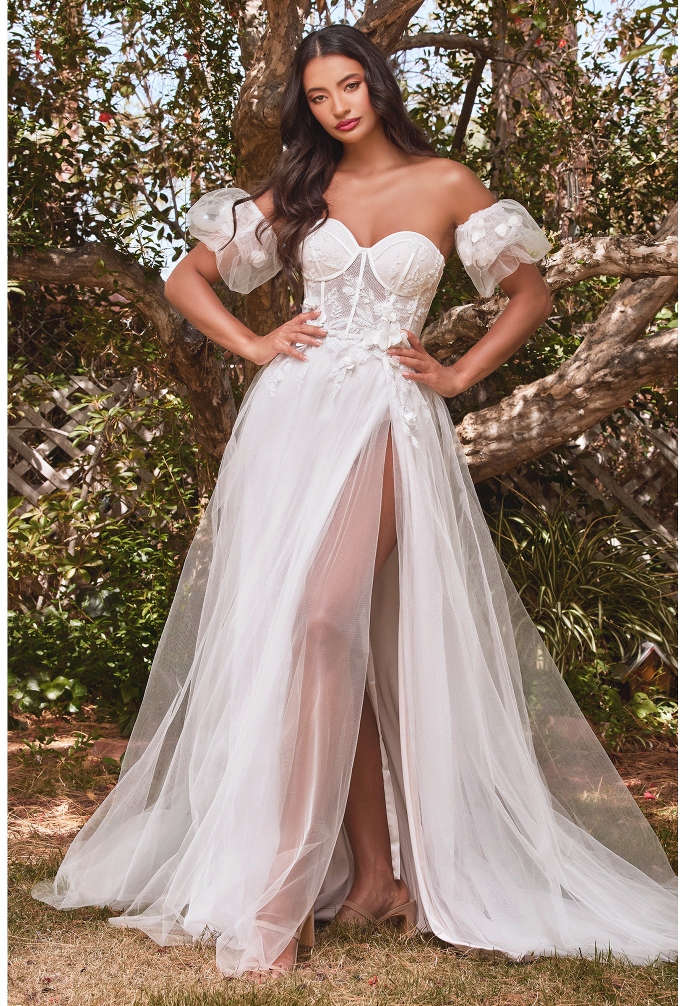 A gorgeous bustier bodice with sparkle tulle and soft tulle over. The skirt is a wrap skirt with a leg slit that can can be adjusted to be a lower leg slit if needed. The sleeves are detachable.