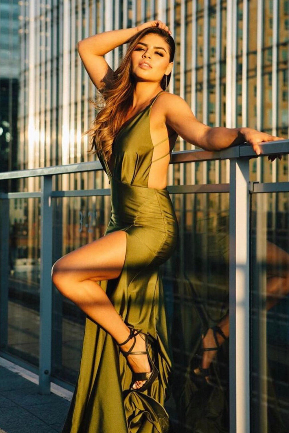 A classic fitted silhouette with a v neckline and beautiful open back. This still comes with a leg slit listed as style 6534H