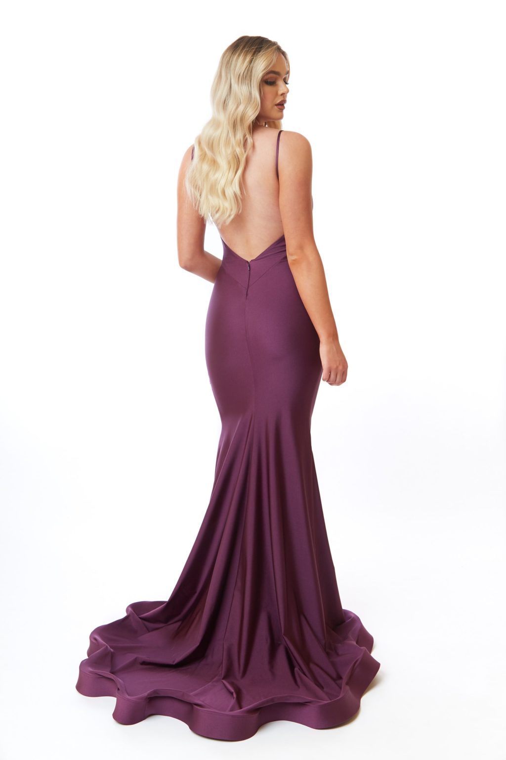 A fitted long dress with a low back with gathering. The front neckline and gathering at the waist is one of our most flattering in all sizes. This dress is made in Lux stretch jersey.