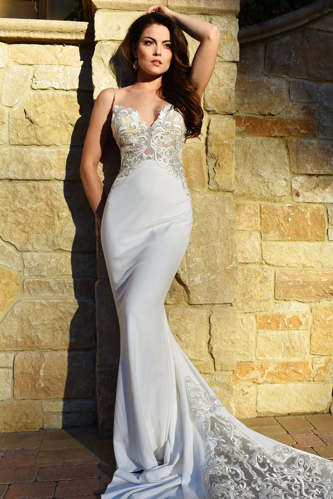 This beautiful bridal gown is a lace sweetheart bodice with a stretch crepe fitted skirt. A cathedral length lace cut out train adds incredible elegance to this dress. This spagehtti straps lightly beaded in pearls.