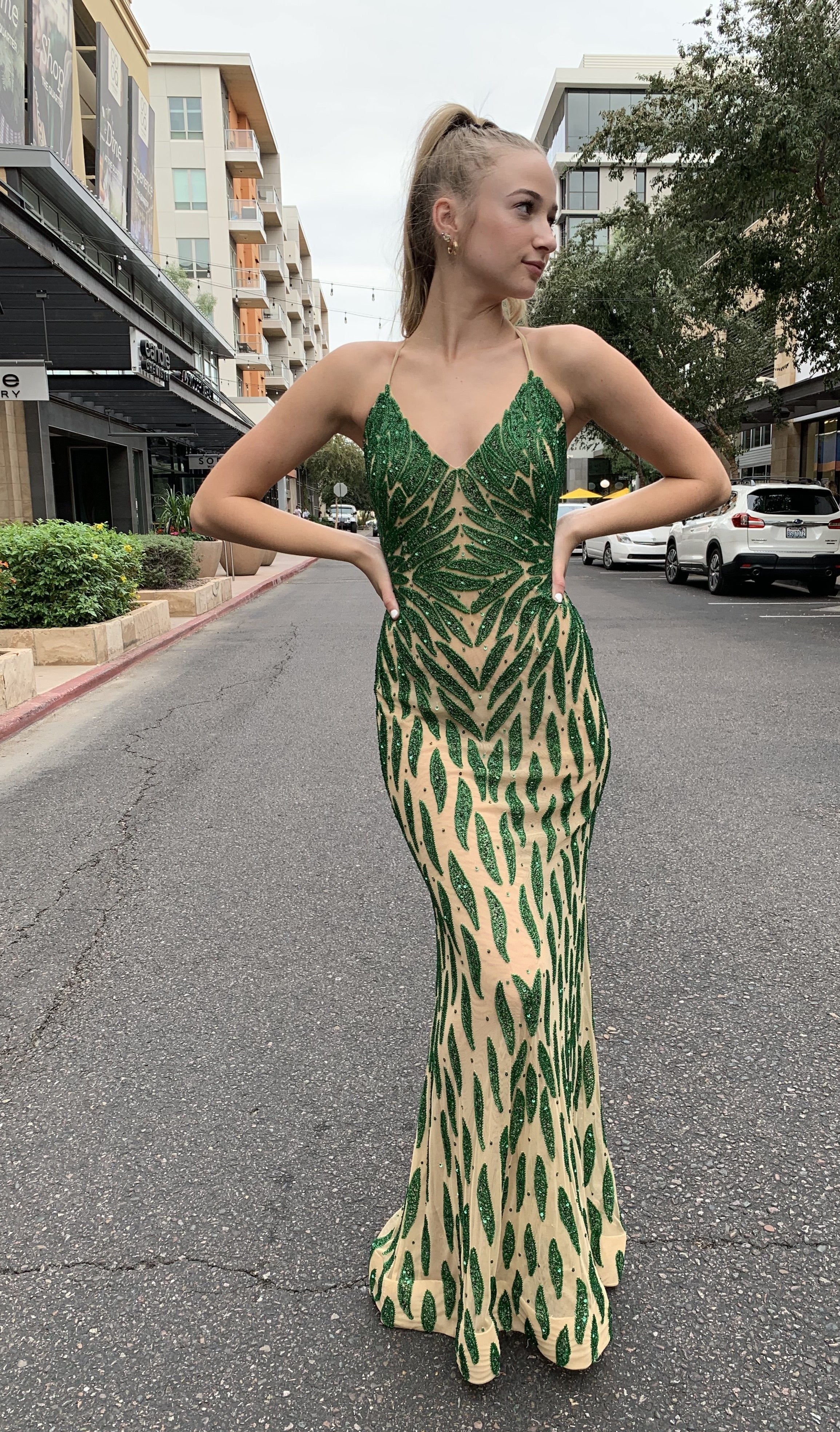 The Emerson gown is a gorgeous evening gown hand beaded on sheer net with long sleeves and a great leg slit. This dress is available in several colors by special order. Please contact us for additional colors.
