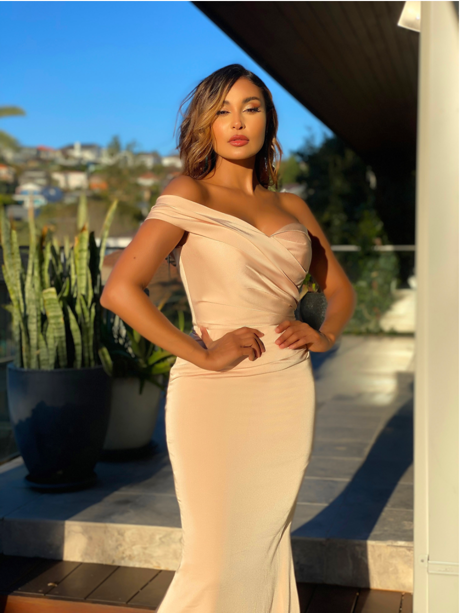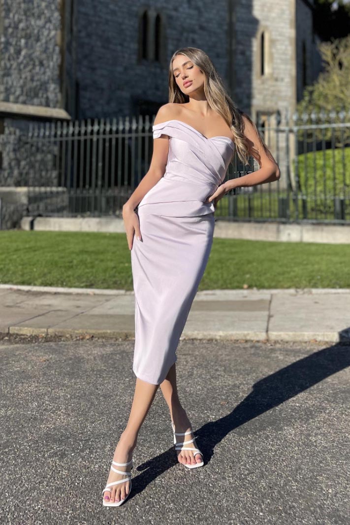 A timeless silhouette in a beautiful satin with off the shoulder straps. Slight gathering at the waistline makes this a very flattering style on all body shapes.