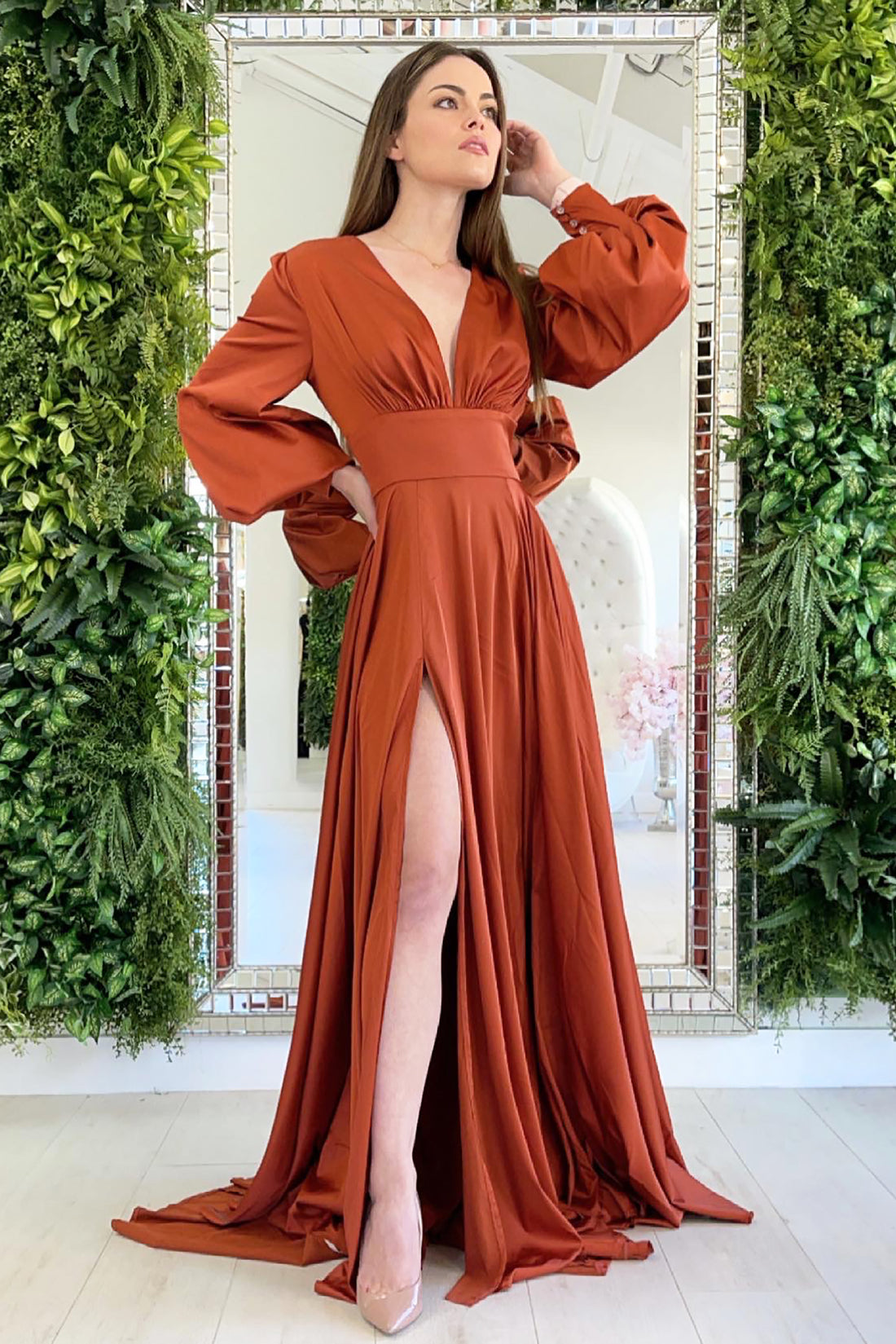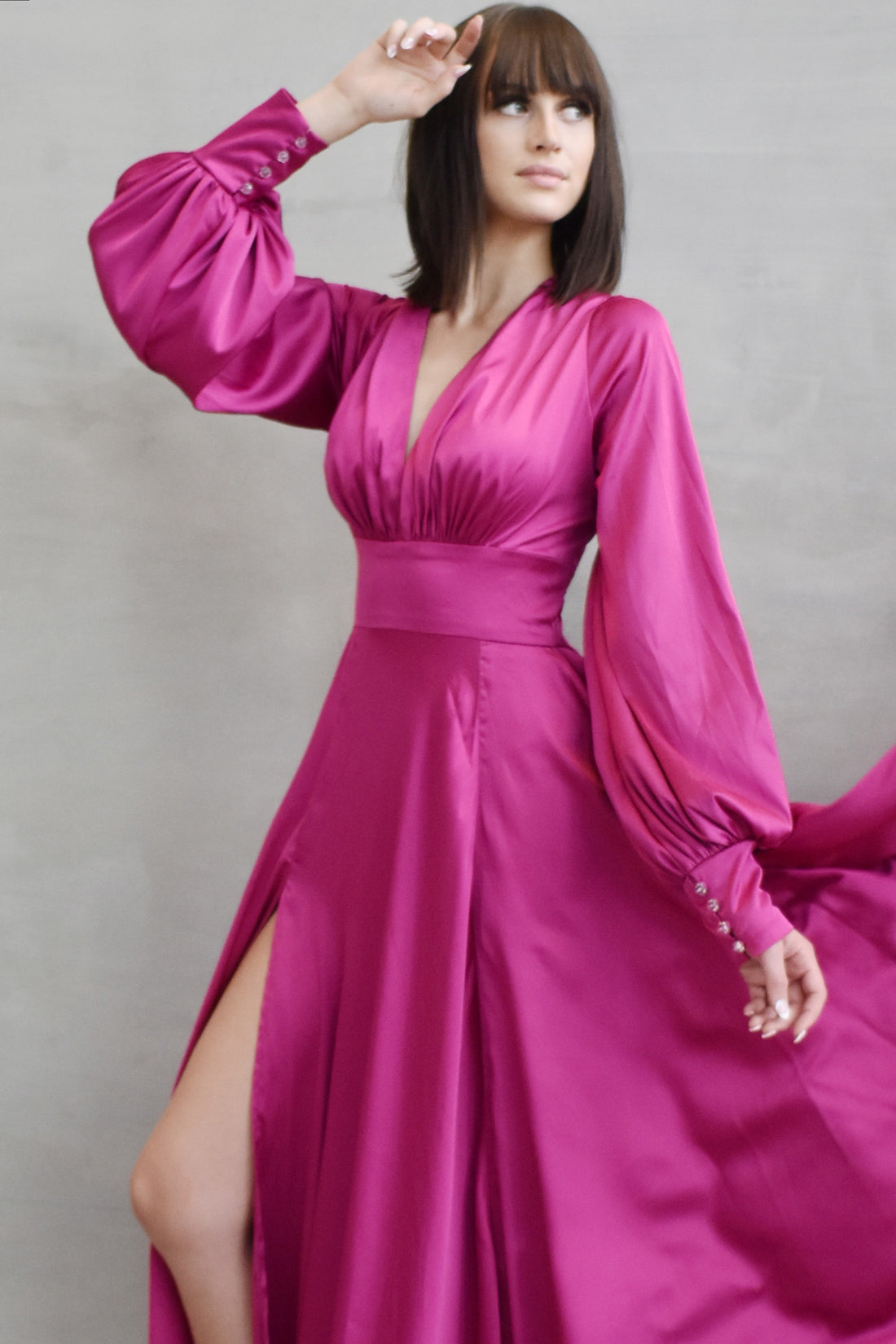 This gorgeous long, hunter green, stretch satin gown sports an a-line skirt and bishop sleeves. The perfect blend of feminine beauty and sophistication