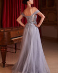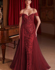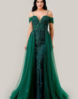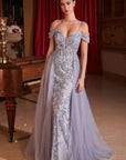 Embrace elegance in this fitted embellished lace gown, a vision of sophistication and grace. The off-the-shoulder tulle straps delicately frame your collarbones, adding a touch of romantic allure. For extra support and a chic detail, thin straps gracefully sit atop your shoulders. The layered tulle overskirt, wrapping to the waistline sides, creates a dreamy and ethereal effect that enhances your every movement. A lace-up corset back not only ensures the perfect fit but adds a hint of romance to this enchanting ensemble