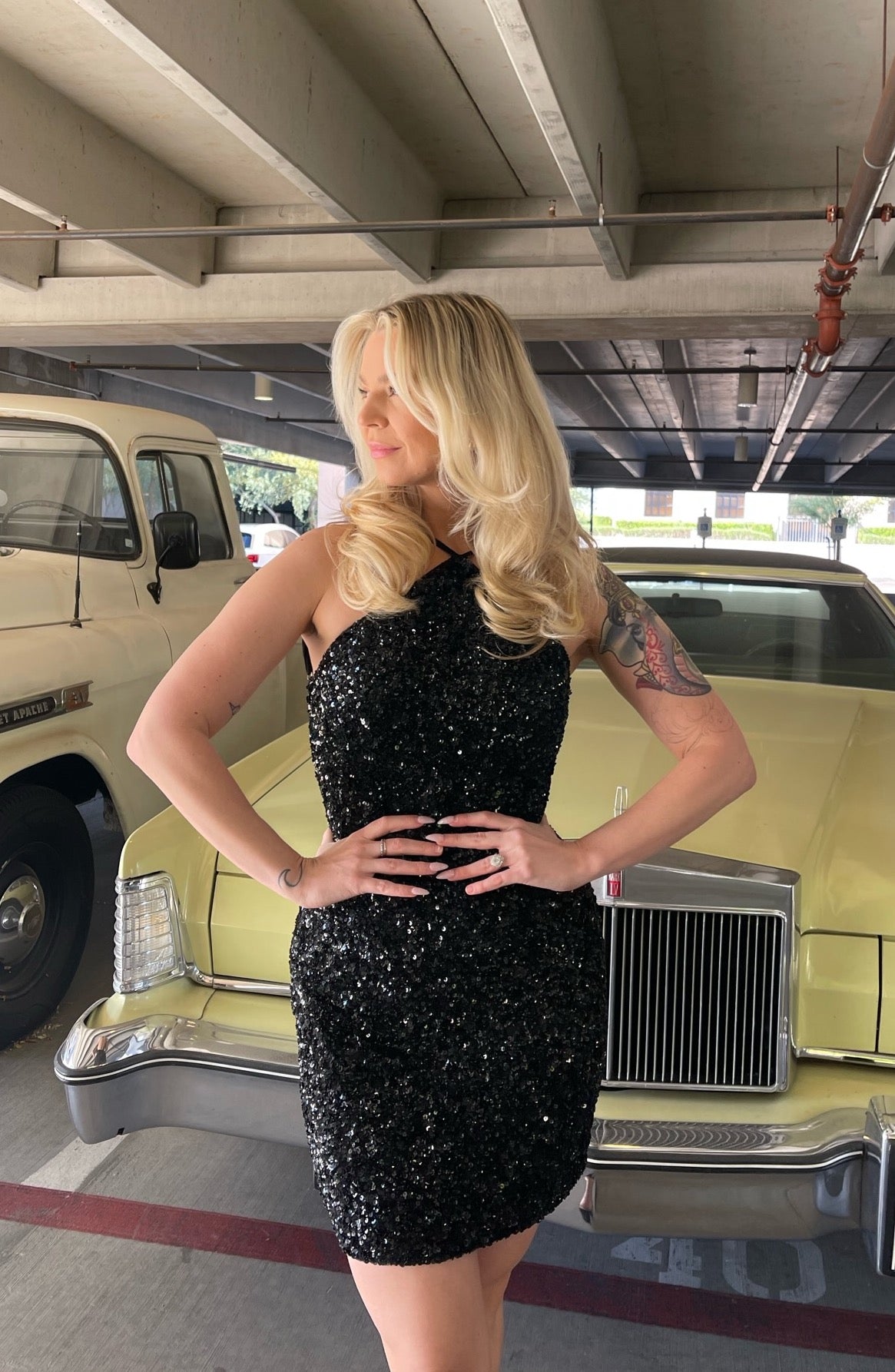 A plunging halter neckline with a fabulous leg slit will always make a great statement dress!  This sequins halter gown is hand beaded and it does have some stretch to it.