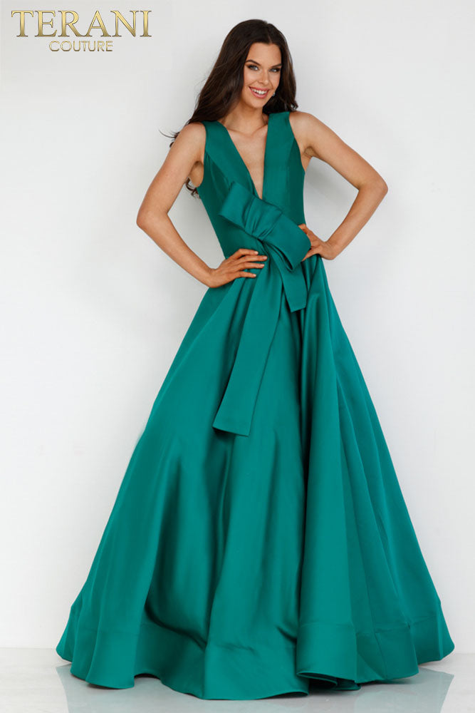 Gorgeous evening gown featuring a deep V neck and A-line silhouette.