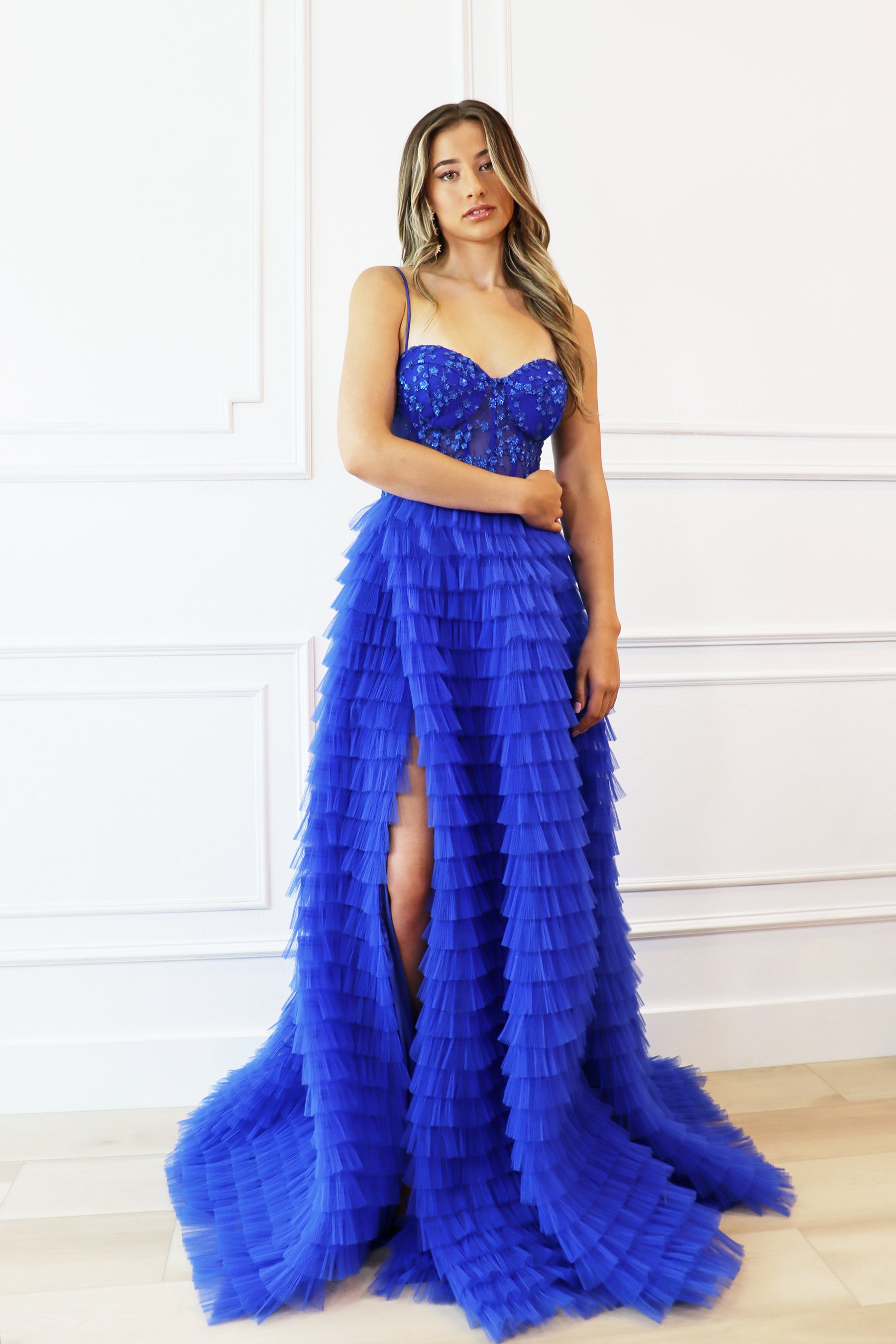 Our favorite bustier bodice embellished with embroidery and sequins with an amazing tiered tulle skirt and fun leg slit.