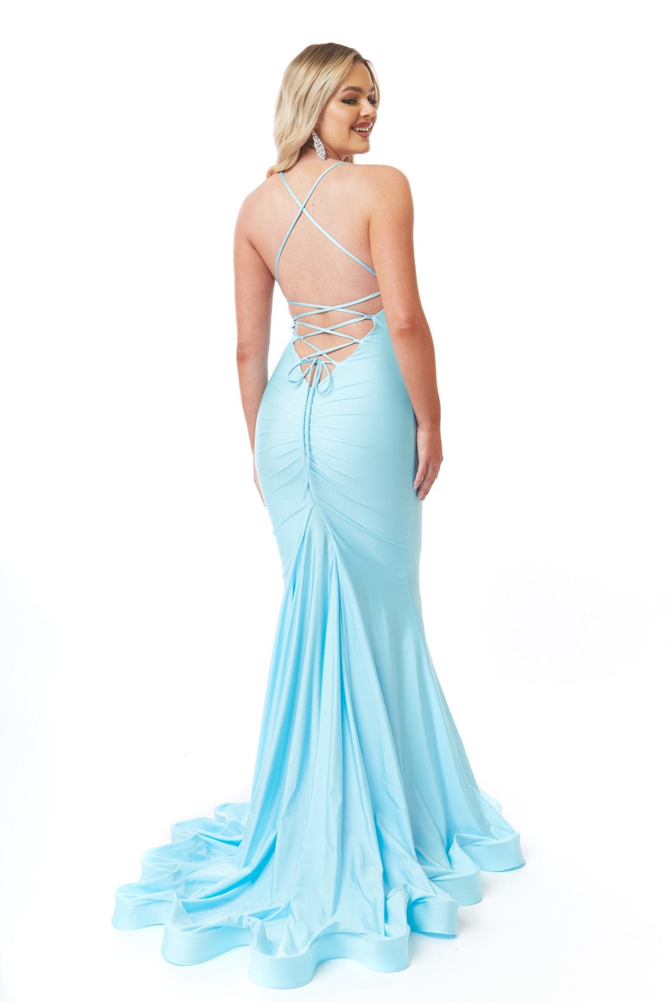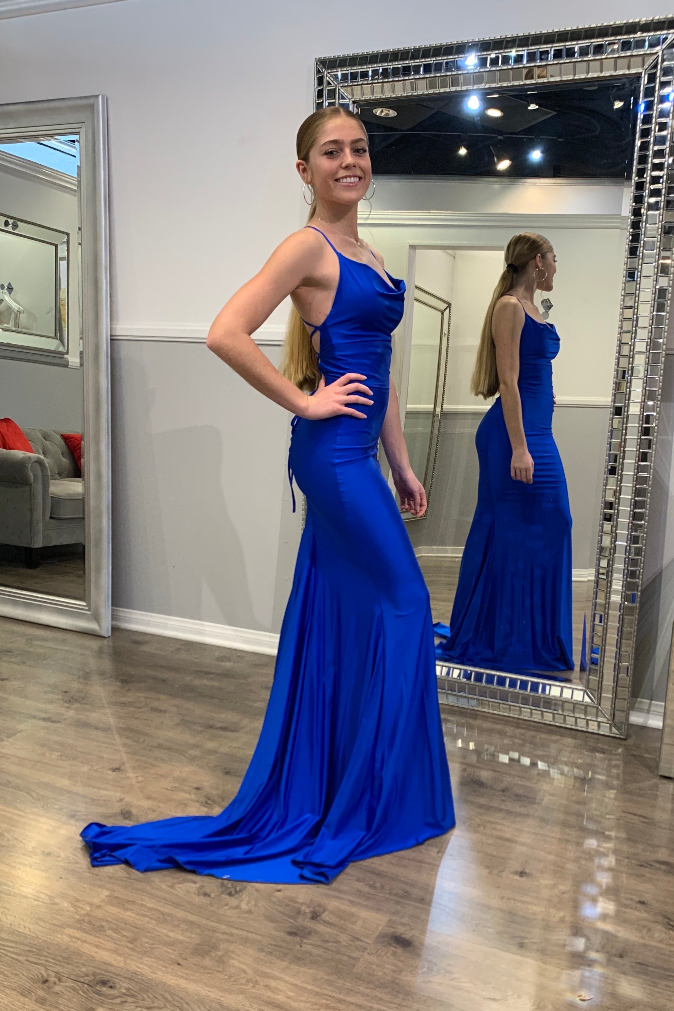 A long formal gown in our favorite lux stretch jersey. This beautiful draped cowl neckline is so elegant while the open lace up back gives such a fun and sexy detail.