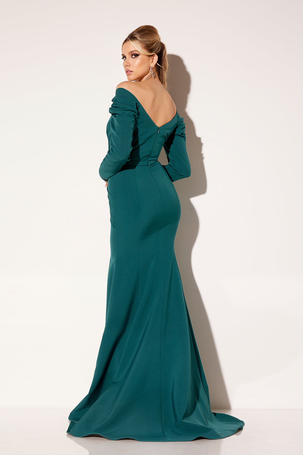 Flattering crepe satin long sleeve gown with a V neckline and mermaid silhouette.