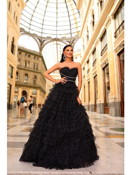 Elevate your evening with this enchanting strapless A-line gown, a masterpiece of modern elegance and timeless allure. Crafted to captivate, the gown features a structured bodice that effortlessly enhances the figure, sculpting a flattering silhouette from bust to waist. The strapless neckline highlights the shoulders and collarbones, framing the décolletage with a touch of sophisticated allure. Descending from the fitted bodice, layers of soft, cascading ruffles define the A-line silhouette, creating a sense of movement and grace with every step. Each ruffle is meticulously placed to enhance the gown's voluminous yet ethereal quality, offering a dynamic contrast to the sleek, fitted upper bodice.