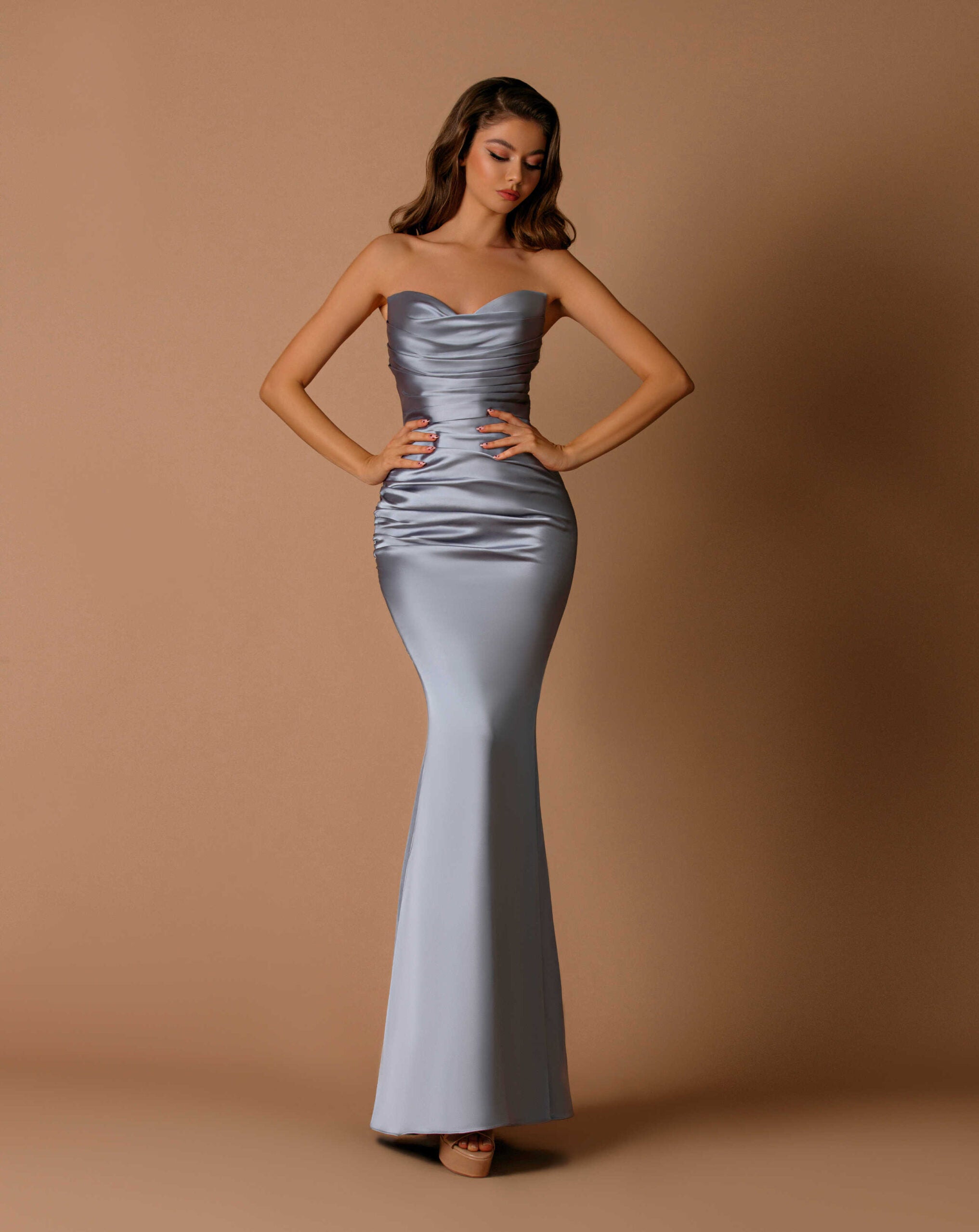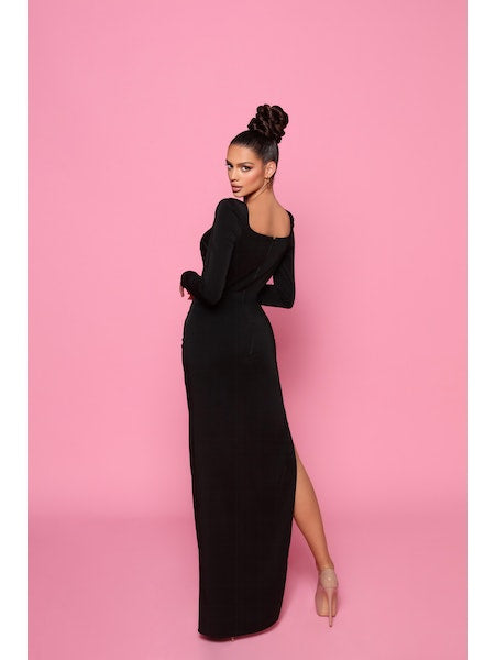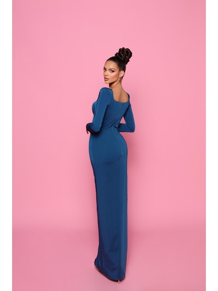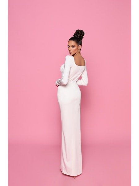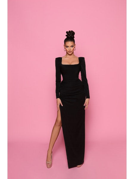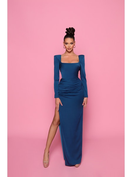 This captivating formal gown showcases an off-the-shoulder design with a twisted bodice detail that exudes sophistication. The sleek silhouette features a thigh-high slit, adding a touch of allure, while the long fitted sleeves create a harmonious balance of elegance and modernity. Available in several stunning colors, this dress is perfect for a red-carpet moment or a glamorous evening event.