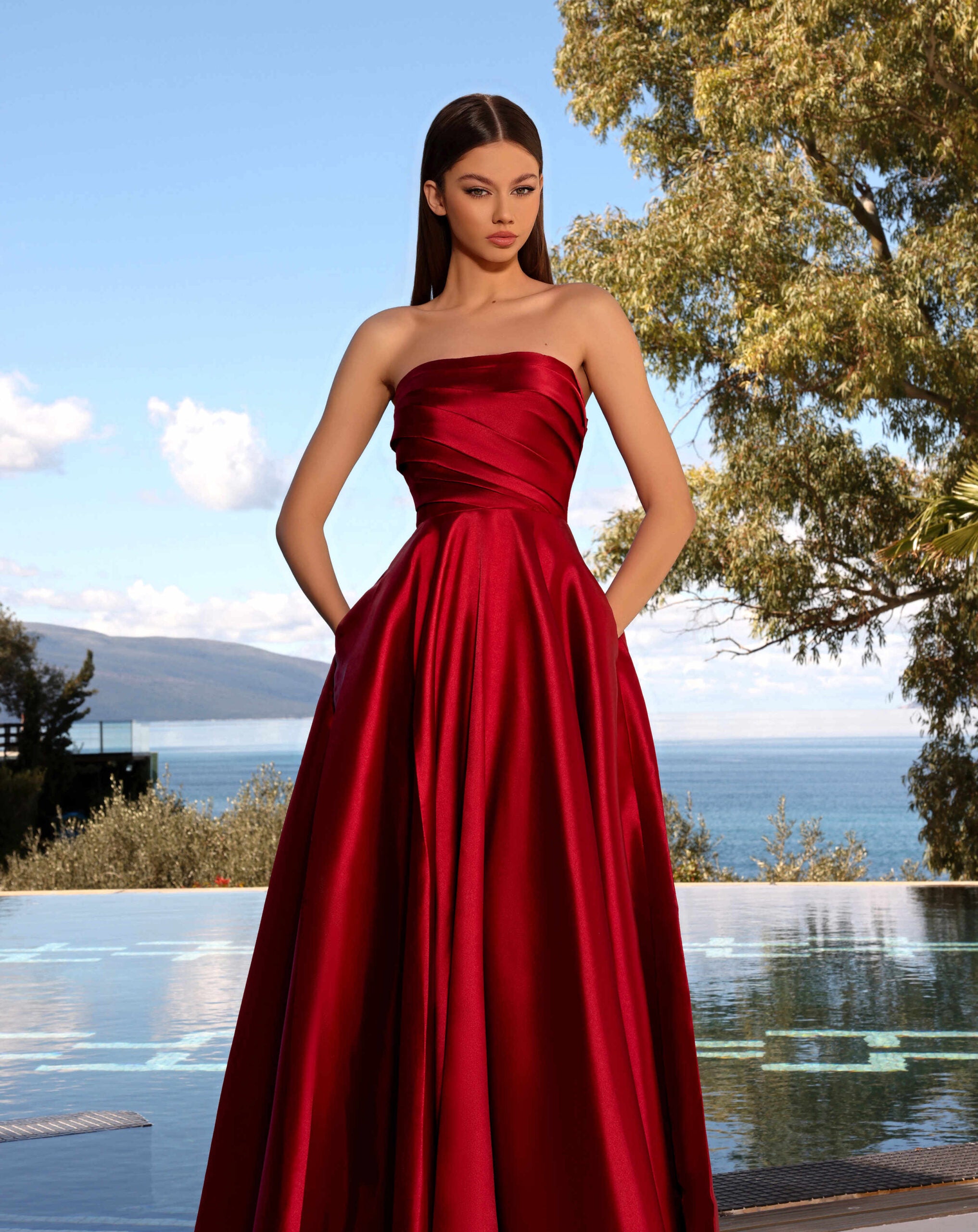 Elegant evening ballgown with strapless, slightly pointed scoop neckline, full a-line skirt, with front leg slit.