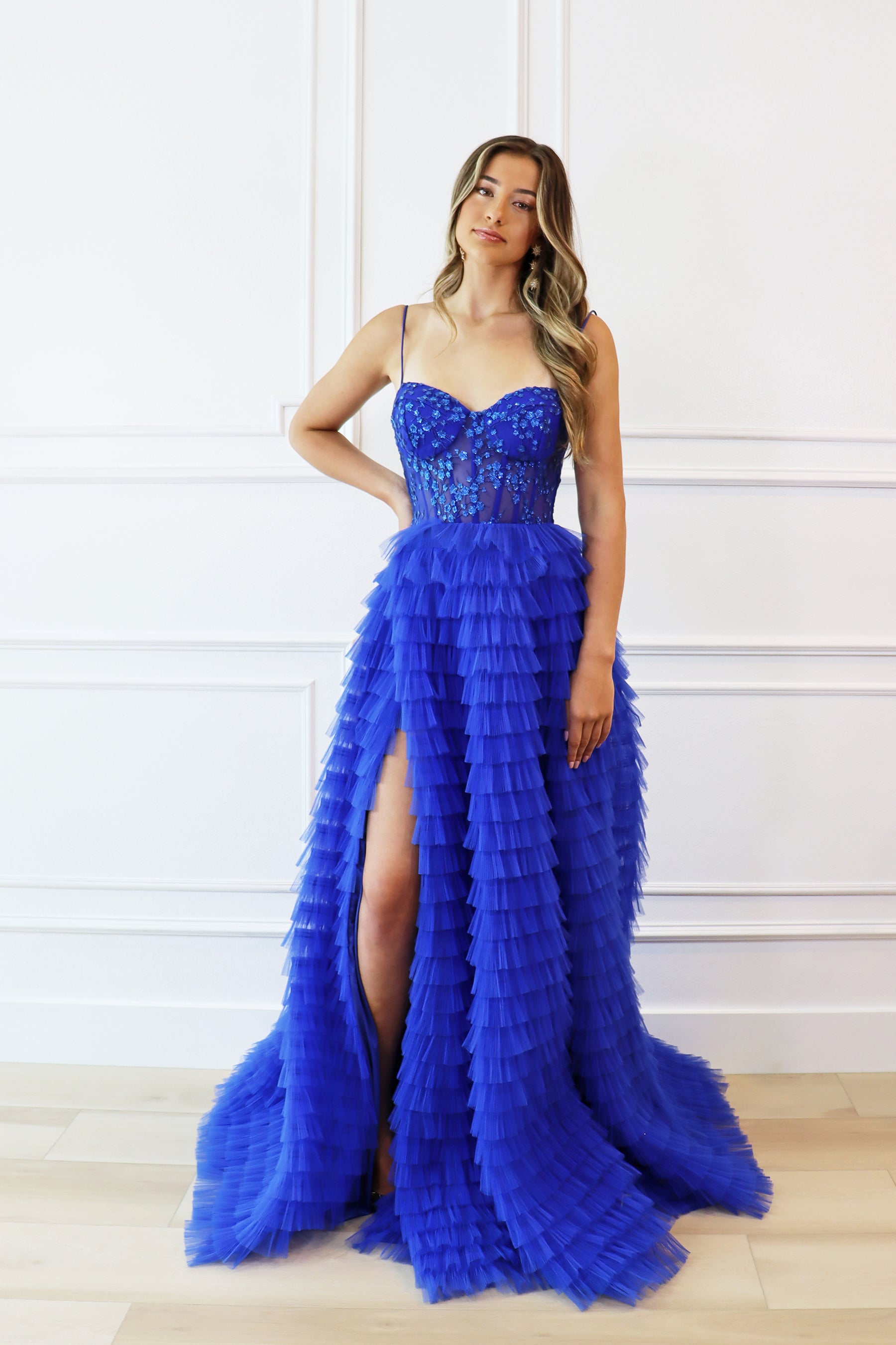 Our favorite bustier bodice embellished with embroidery and sequins with an amazing tiered tulle skirt and fun leg slit.