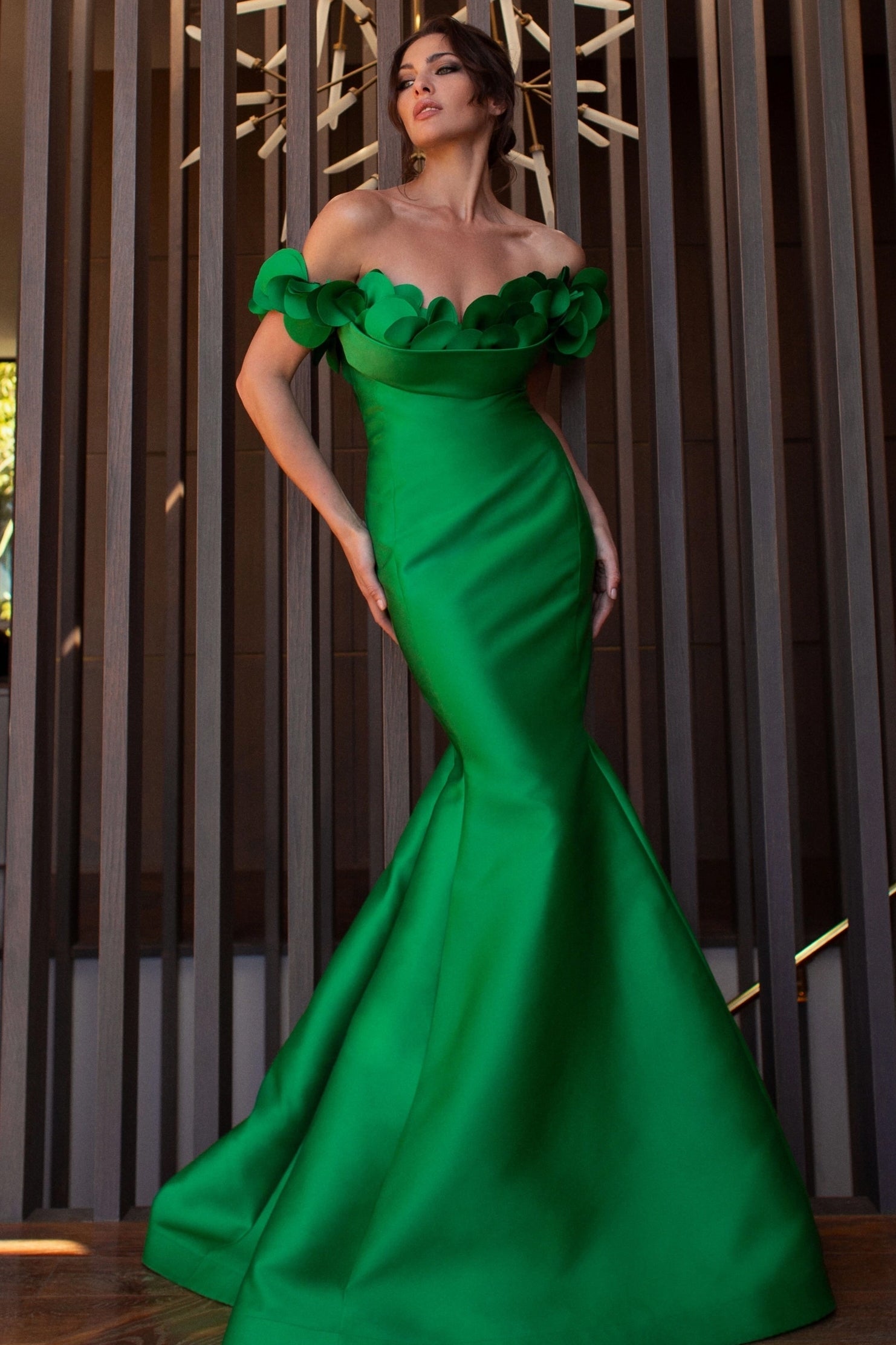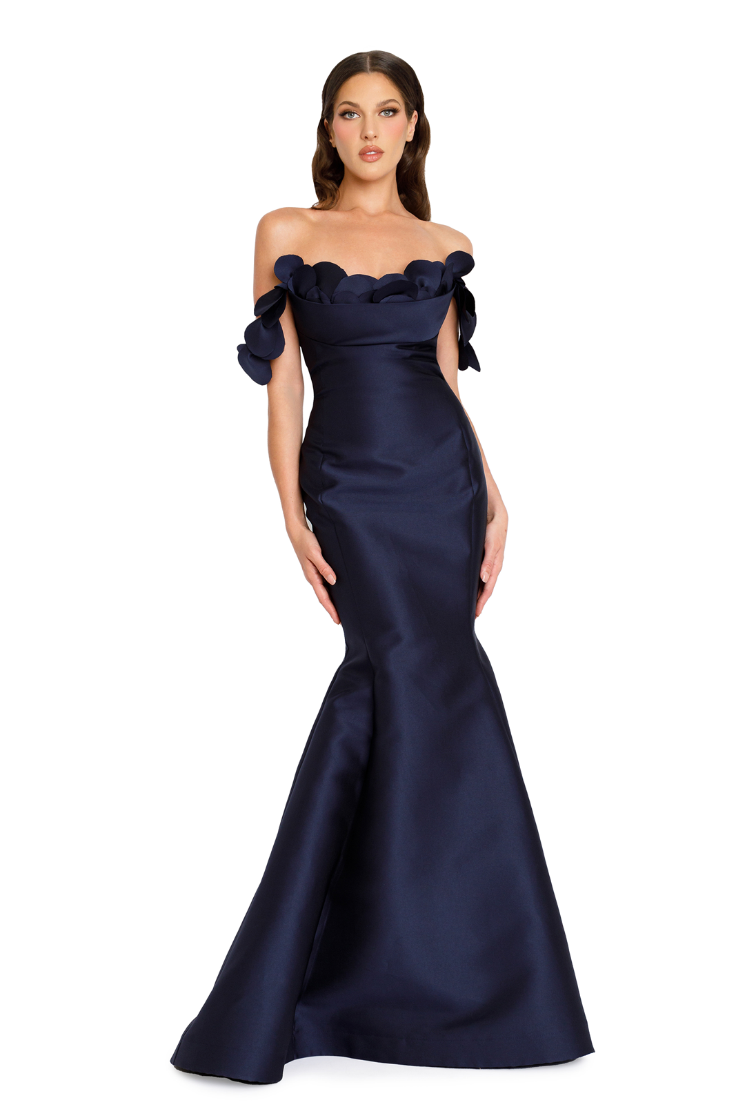 Fitted mermaid silhouette with off the shoulder sleeves.