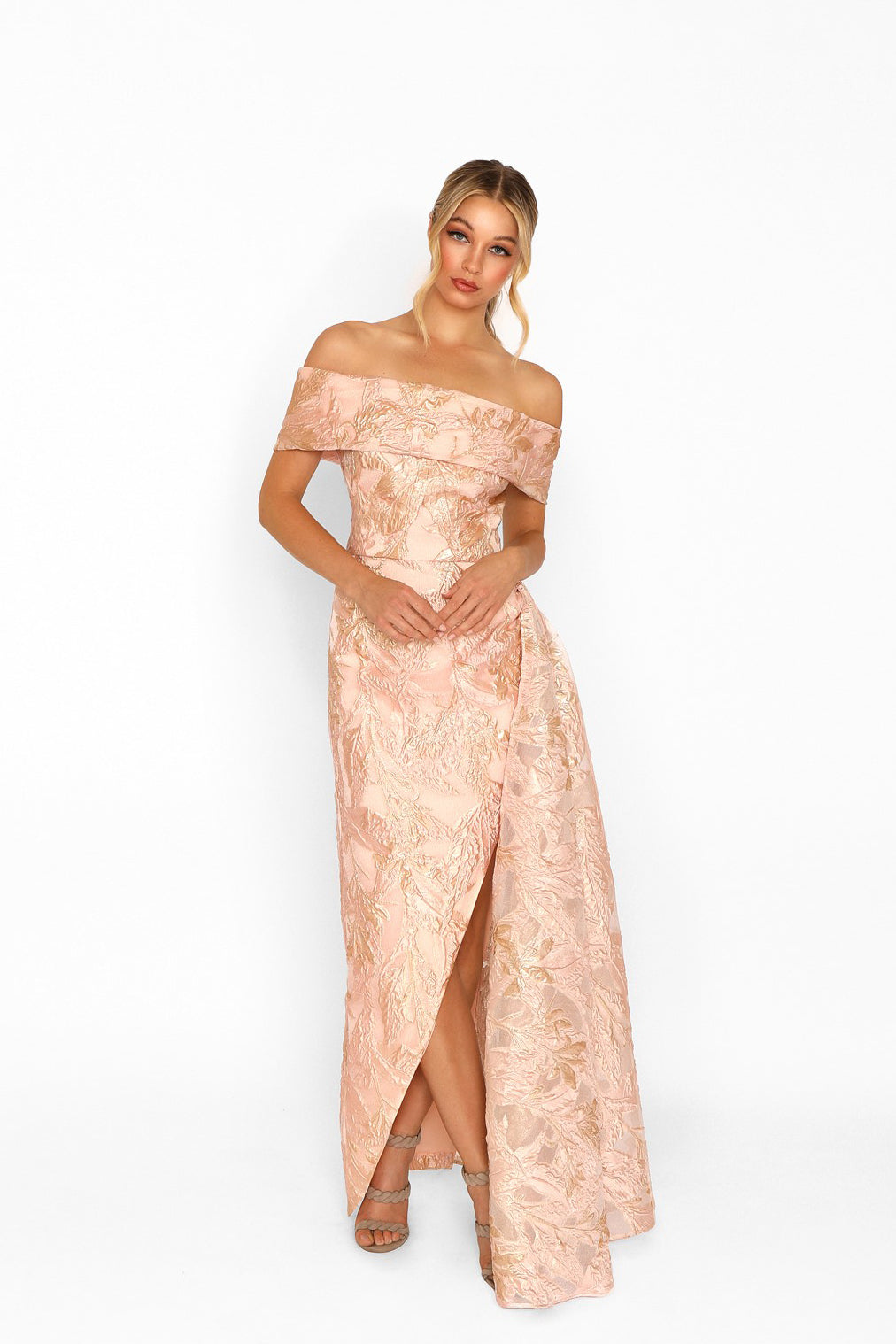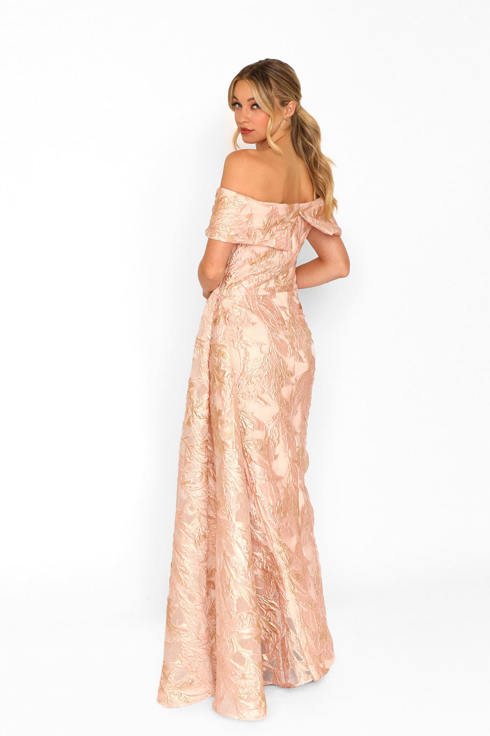 A long fitted evening gown with a wrap skirt and a draped bustier bodice.