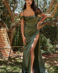 Slim fitted satin evening gown with a wrap skirt and high leg slit. This dress is a classic style with modern feminine flair. Off-the-shoulder sleeves and draped front bodice.