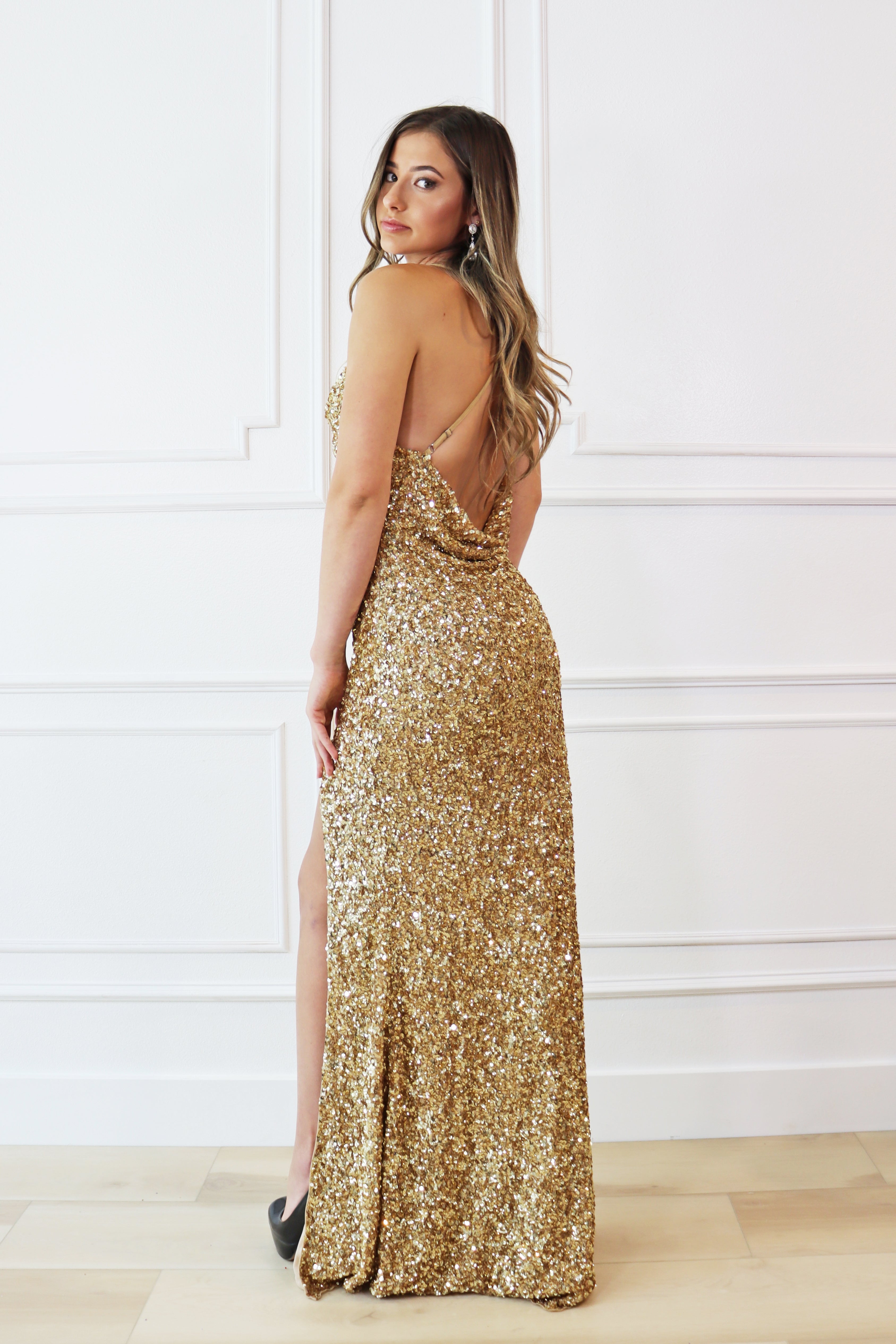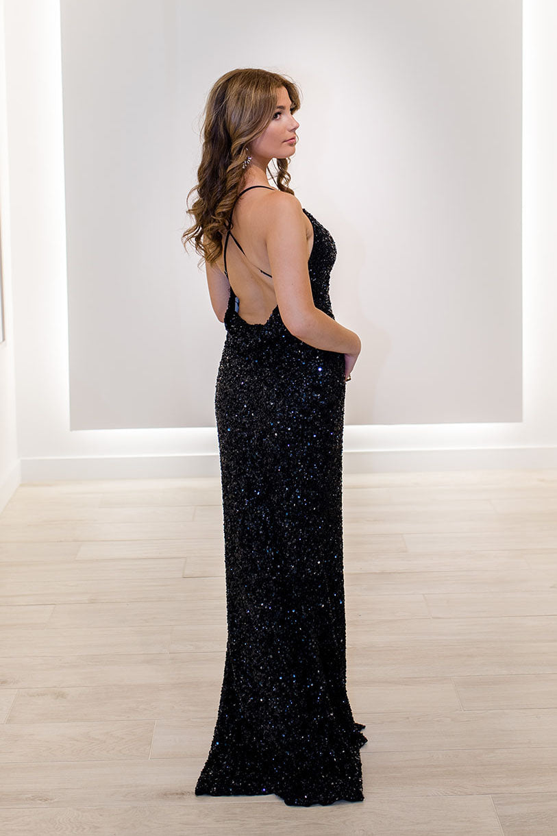 The Aria gown is hand beaded with sequins on a stretch net and lining. A high leg slit and low back detail with the incredible beading make this a show stopper in every color!
