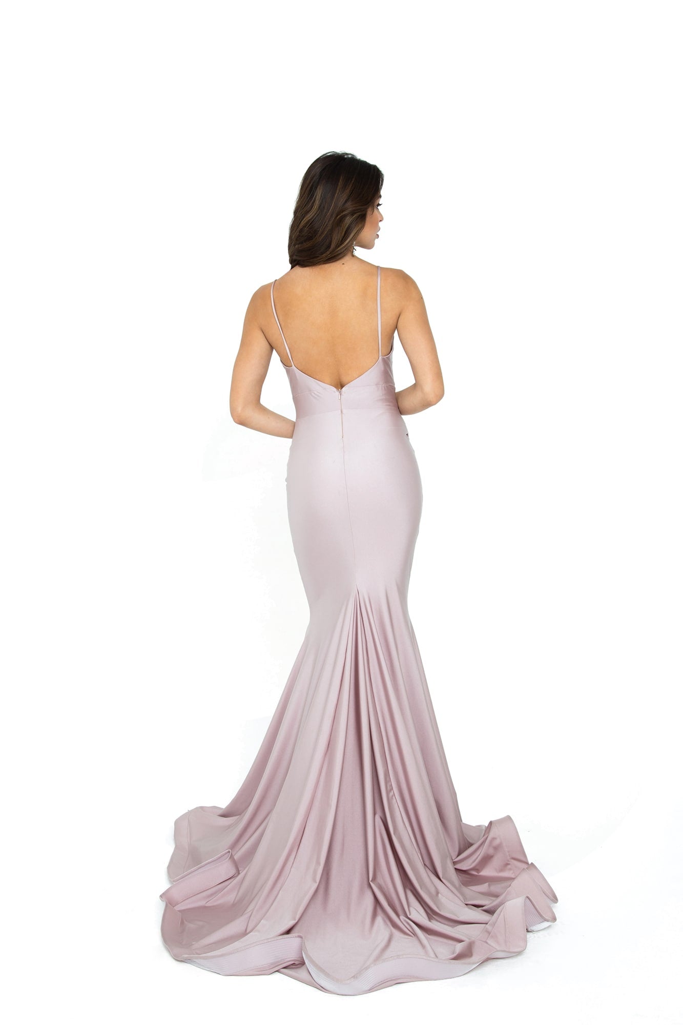 A fitted long dress with a low back, and v neckline. This dress is made in Lux stretch jersey.