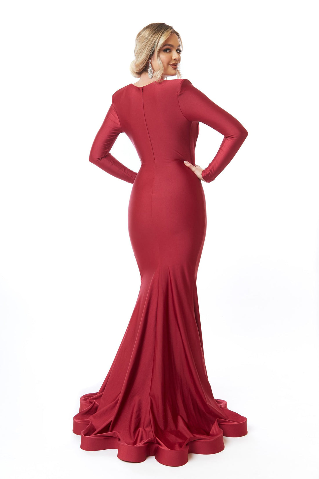 A fitted long evening dress with a plunging cowl neckline and long sleeves. This dress is made in Lux stretch jersey.