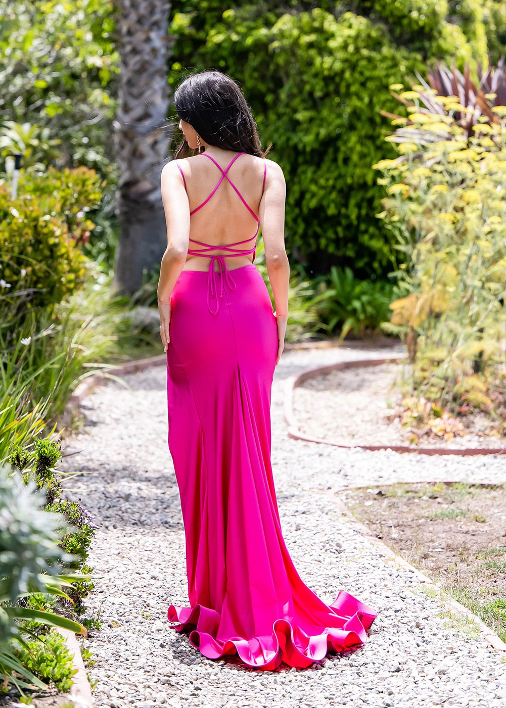A fitted long dress with a low back, and v neckline. Get the perfect fit with the adjustable tie up back. This dress is made in Lux stretch jersey.