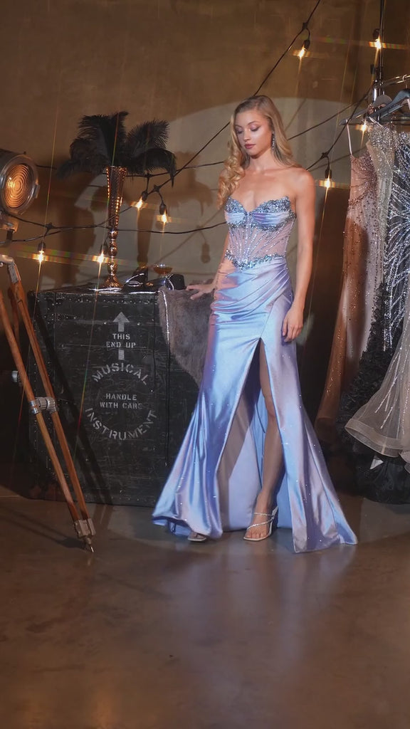 Turn heads in this fitted evening gown, featuring a sheer corset bodice embellished with intricate beadwork and lace embroidery that creates a soft, luminous glow. The strapless neckline highlights the shoulders, while the ruched satin skirt drapes elegantly over the hips and opens into a sleek slit that elongates the figure. Finished with sparkling accents for radiant shine, this gown is perfect for prom, galas, and sophisticated evening celebrations.
