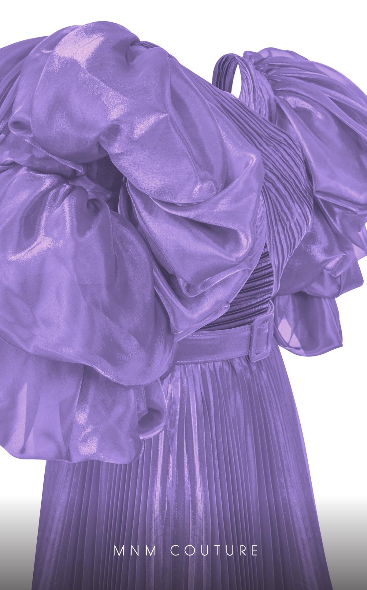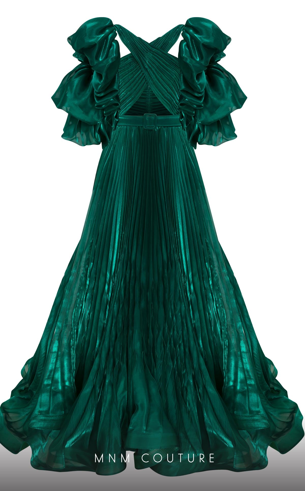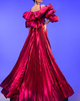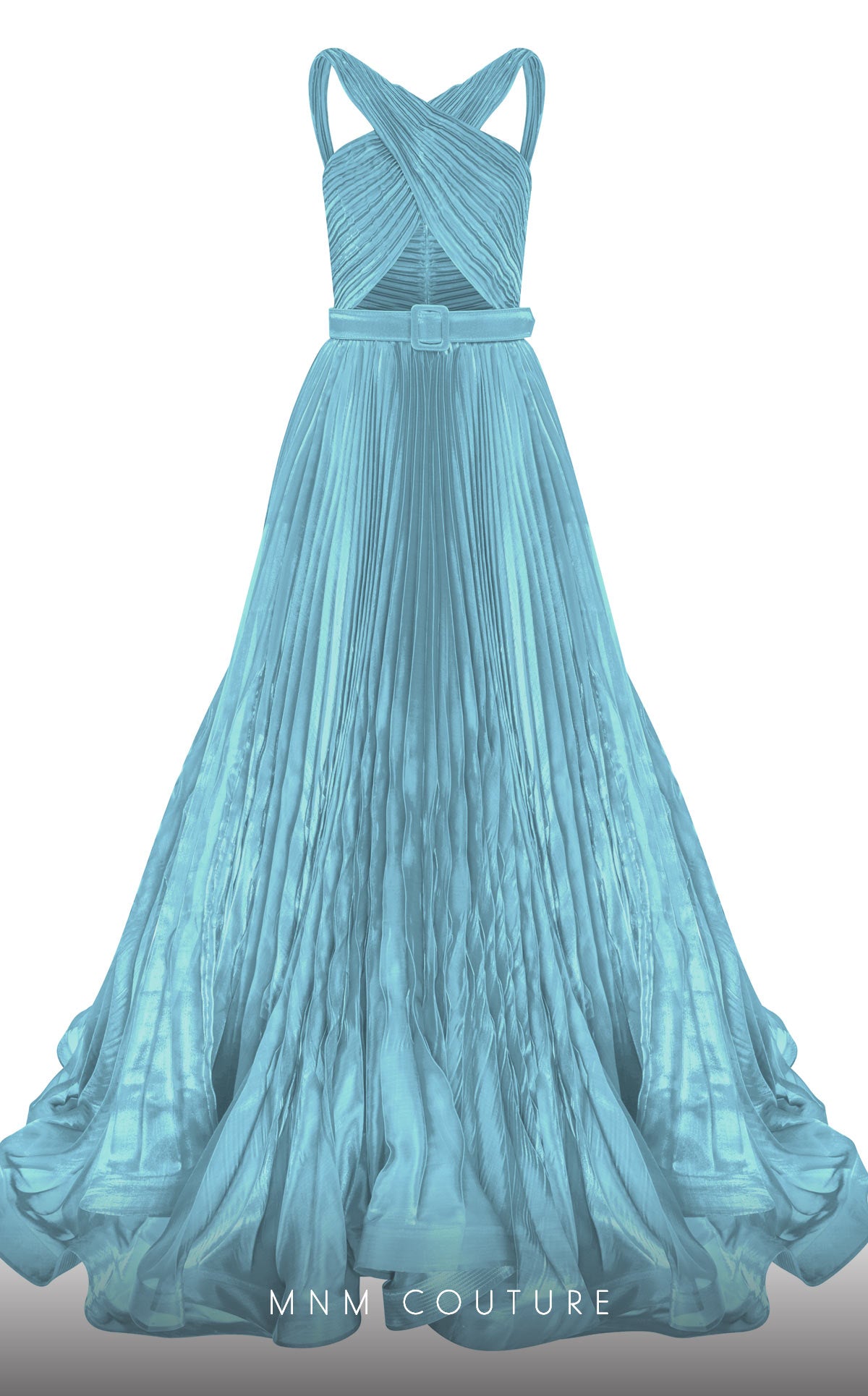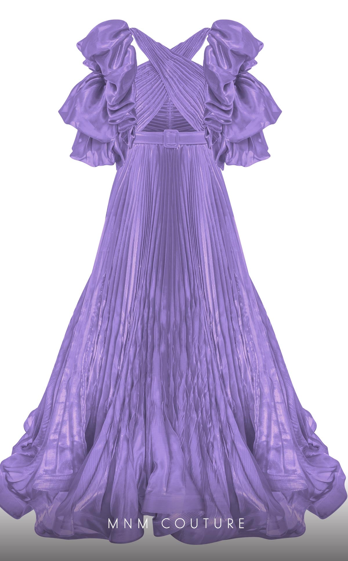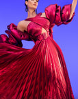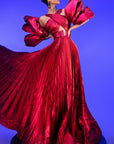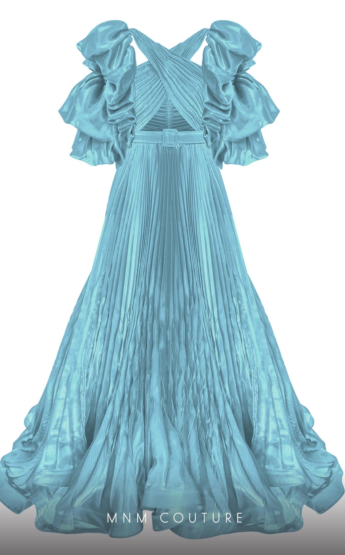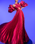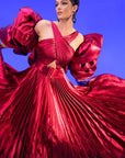 A bold fusion of drama and elegance, this evening gown features a sculpted crisscross bodice with a peekaboo cutout and structured belt at the waist. Removable voluminous puff sleeves and intricate knife pleats cascade into a full, flowing skirt, delivering high-impact glamour from every angle.