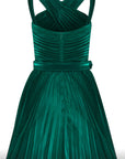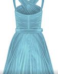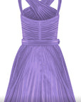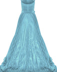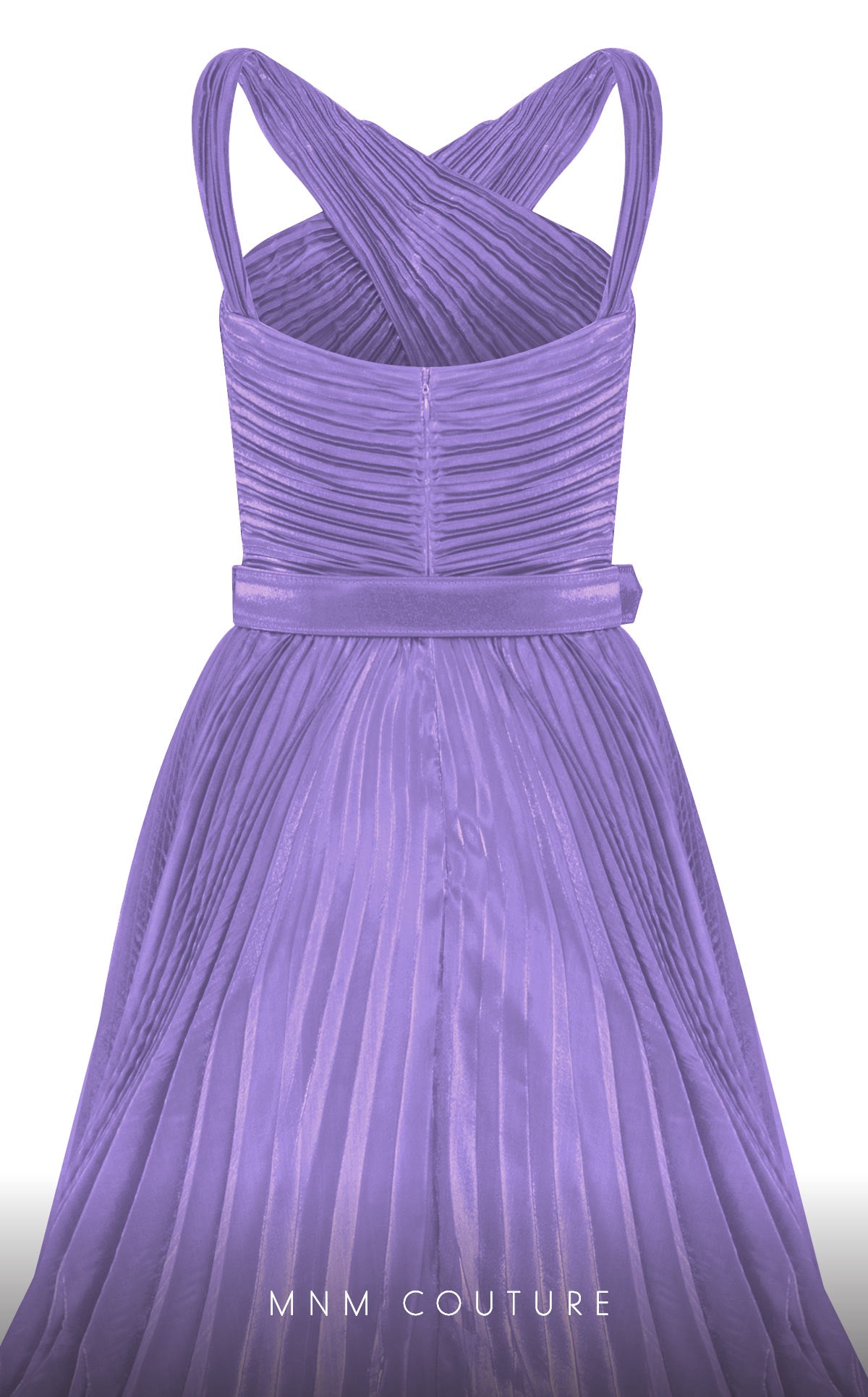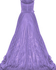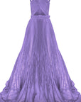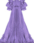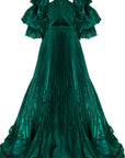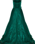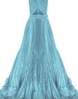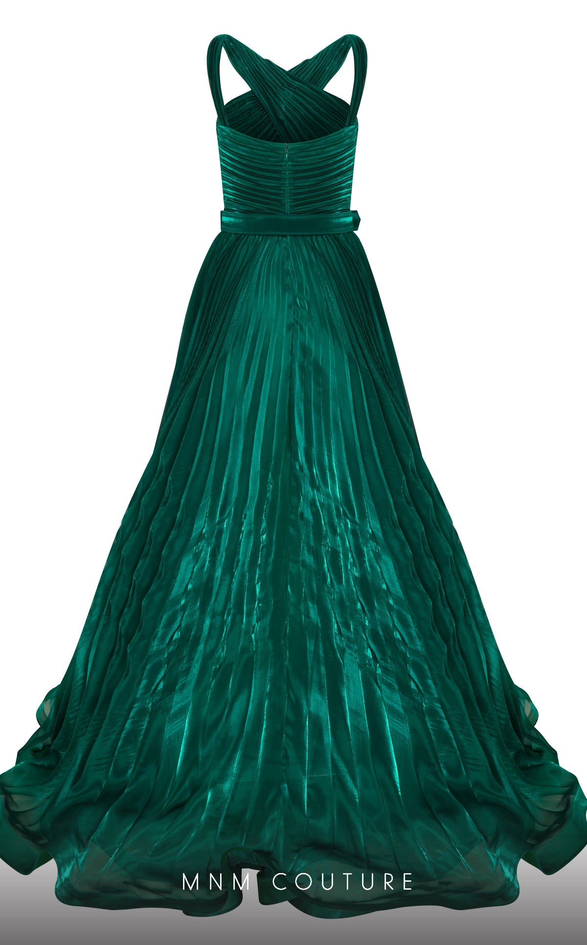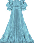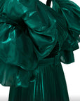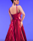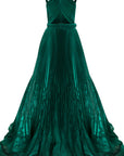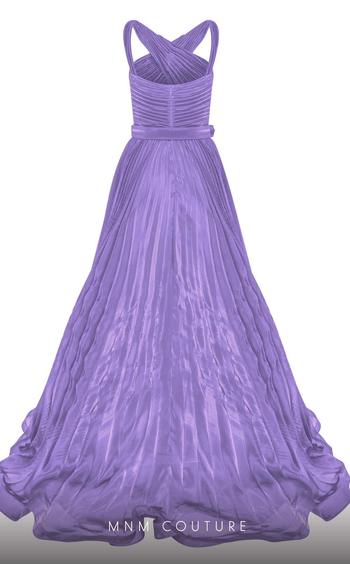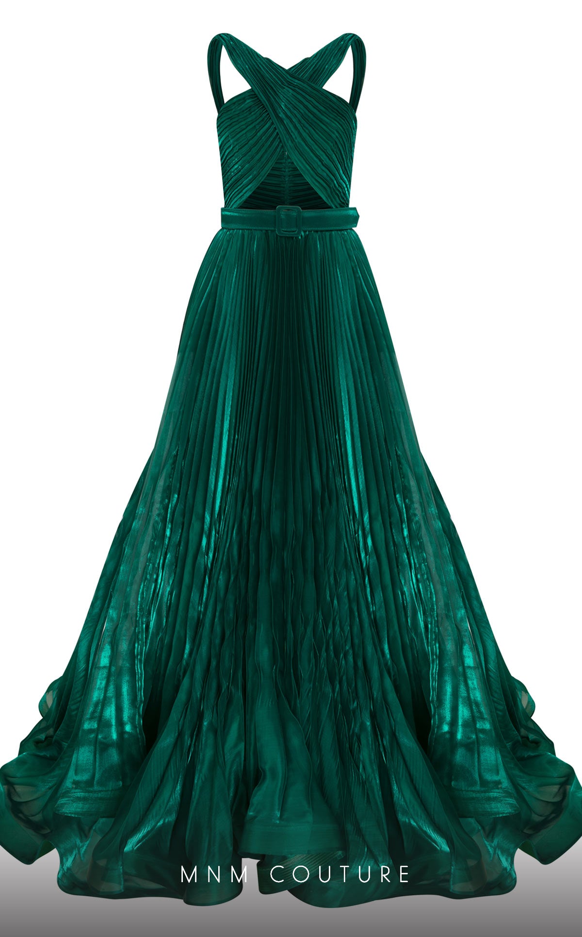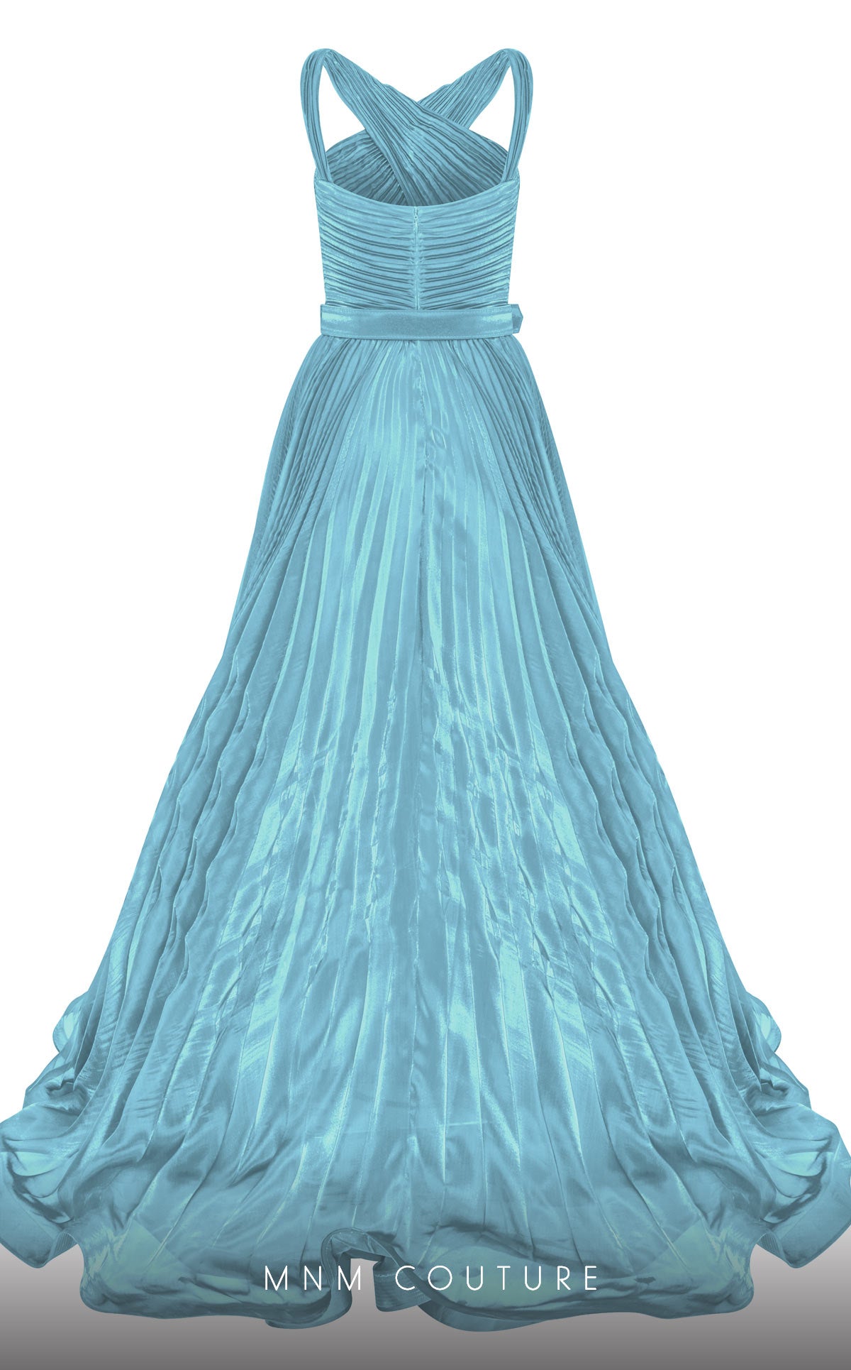 A bold fusion of drama and elegance, this evening gown features a sculpted crisscross bodice with a peekaboo cutout and structured belt at the waist. Removable voluminous puff sleeves and intricate knife pleats cascade into a full, flowing skirt, delivering high-impact glamour from every angle.