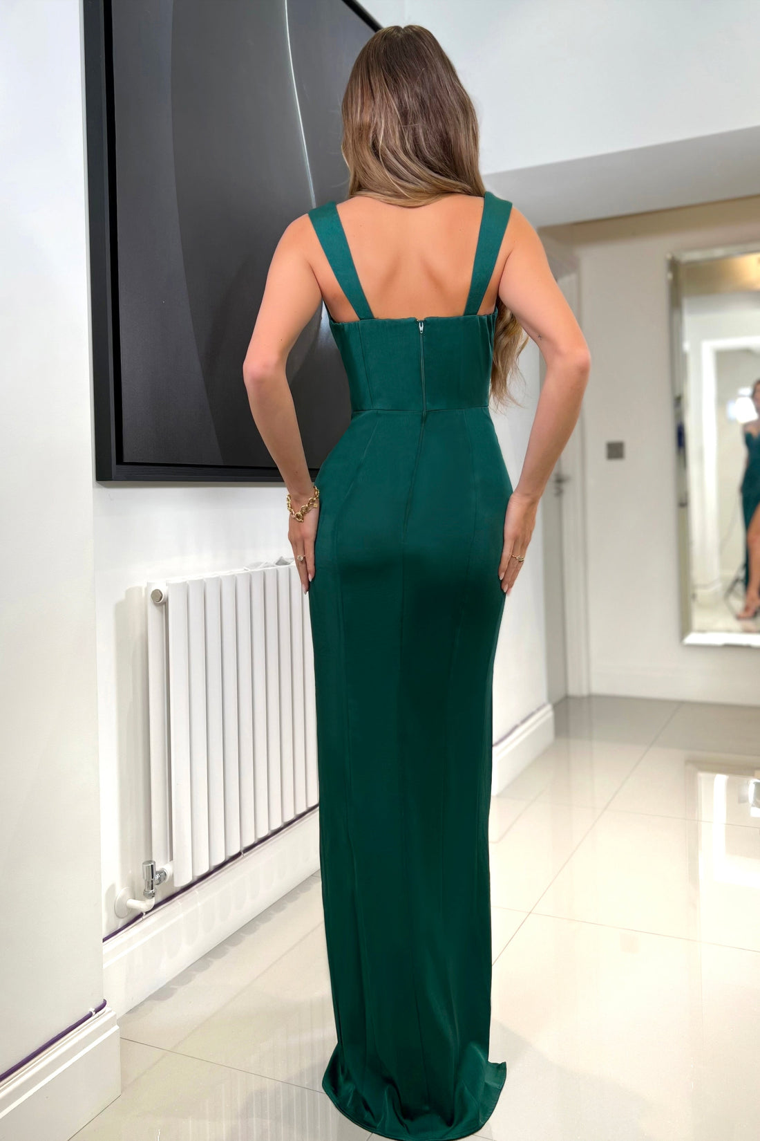 The fitted satin evening gown that is perfect for attending a wedding! A sweetheart bodice with straps and a flattering fitted wrap skirt.