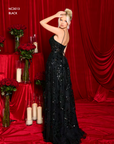This striking full-length gown by Nicoletta Style NC3013 showcases a plunging V-neckline with structured shoulder straps and a flowing A-line silhouette. Intricate beadwork and sequins add texture and shimmer throughout. Finished with a concealed back zip, built-in padding, and lining for a sleek fit.