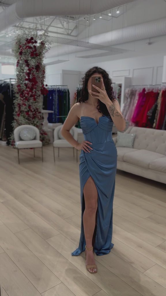 A luxury soft stretch satin evening dress with a pleated bodice and a slim fitted wrap skirt.