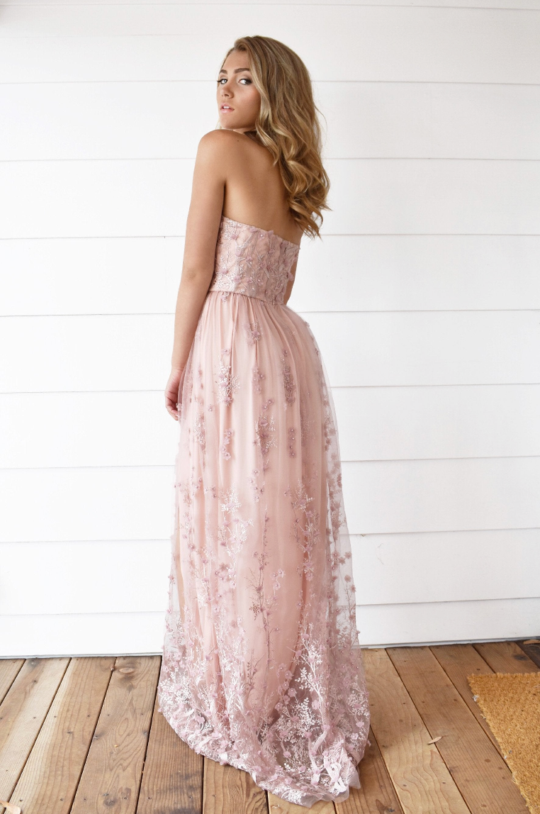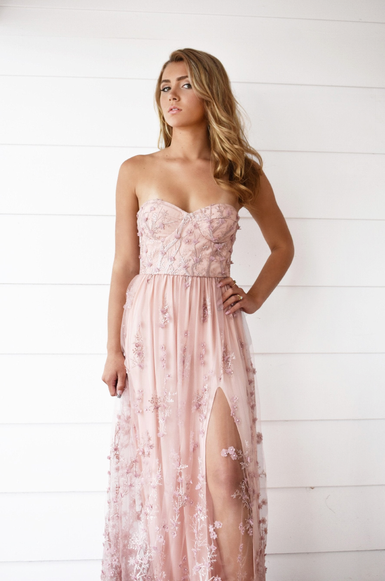 Our beautiful 3D floral embroidery in a strapless bustier bodice with a soft A-line net skirt. There is a leg slit over the front left leg in the jersey lining only.