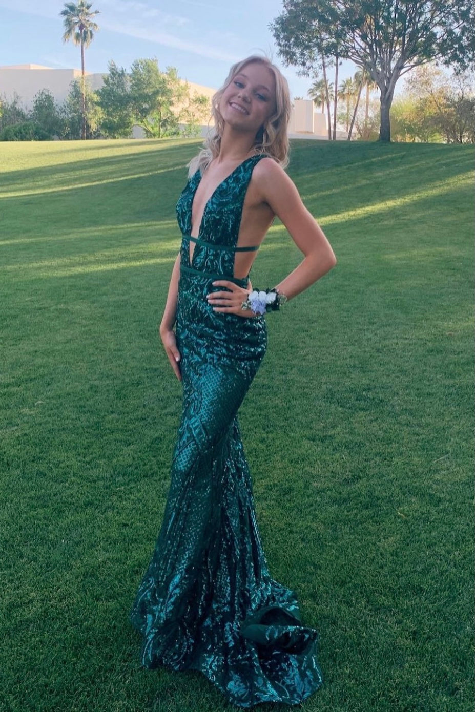 Sequins v-neck long dress with body suit built in. The legs are sheer.