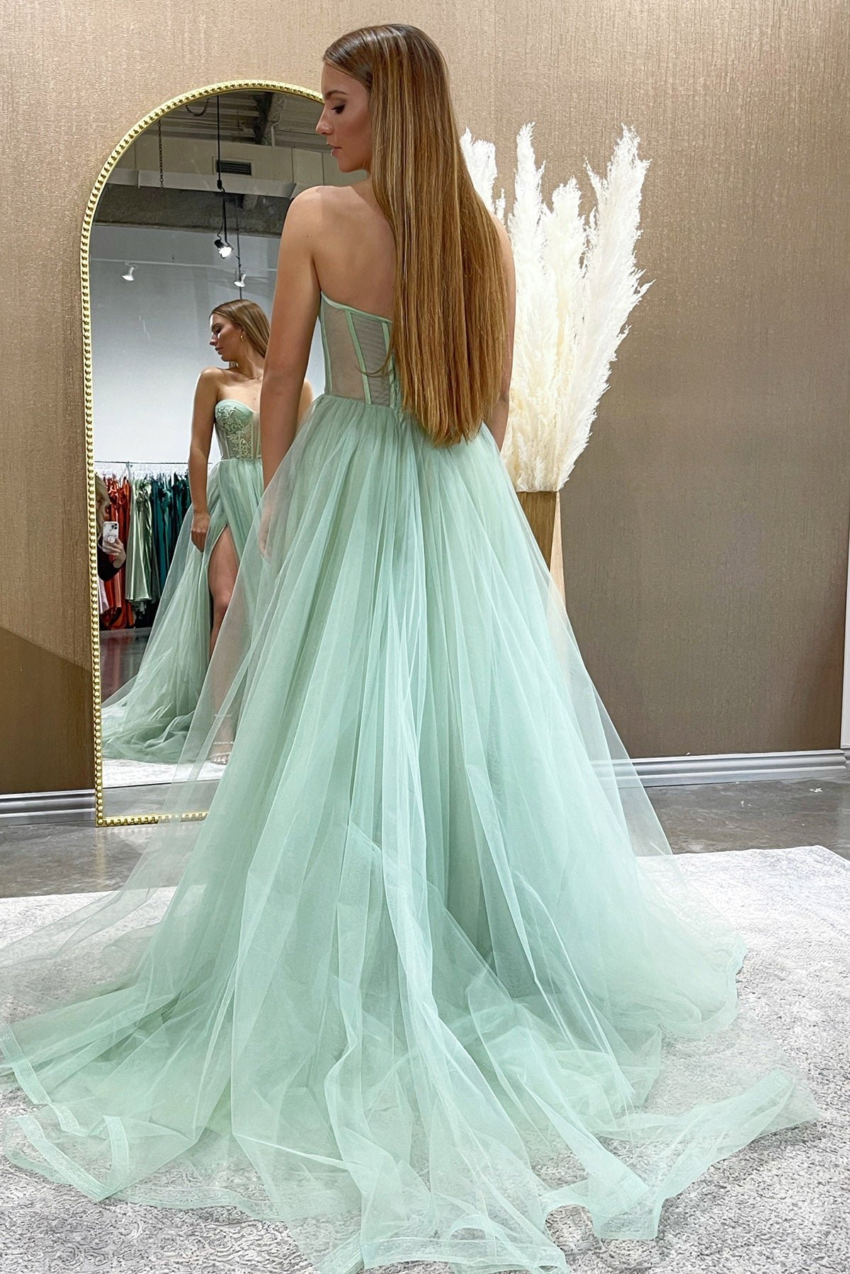 The Brentwood gown is perfect for the little bit of cinderella in everyone. The bodice is pleated in tulle with embellished lace appliques. The soft tulle wrap skirt features a fun leg slit and pockets!