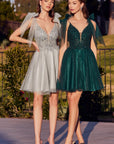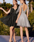Shine bright in this short A-line dress, designed with a layered glitter tulle skirt that catches the light with every move. The V-neck lace bodice and mid open back adds structure and subtle edge, balanced by soft, adjustable tulle tie straps at the shoulders. The perfect style for homecoming, or any night that calls for standout style.