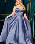 A long evening dress with a corset lace up back and sweetheart bustier bodice. The fabric is a soft satin making this A-line skirt very flattering.