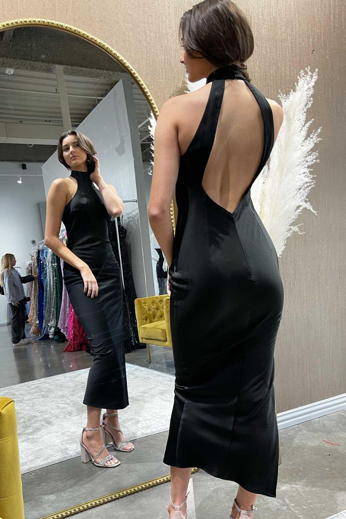 Timeless and sophisticated is defined by this gorgeous halter gown with a low open back and side leg slit.